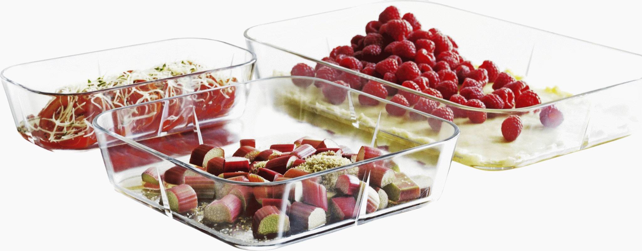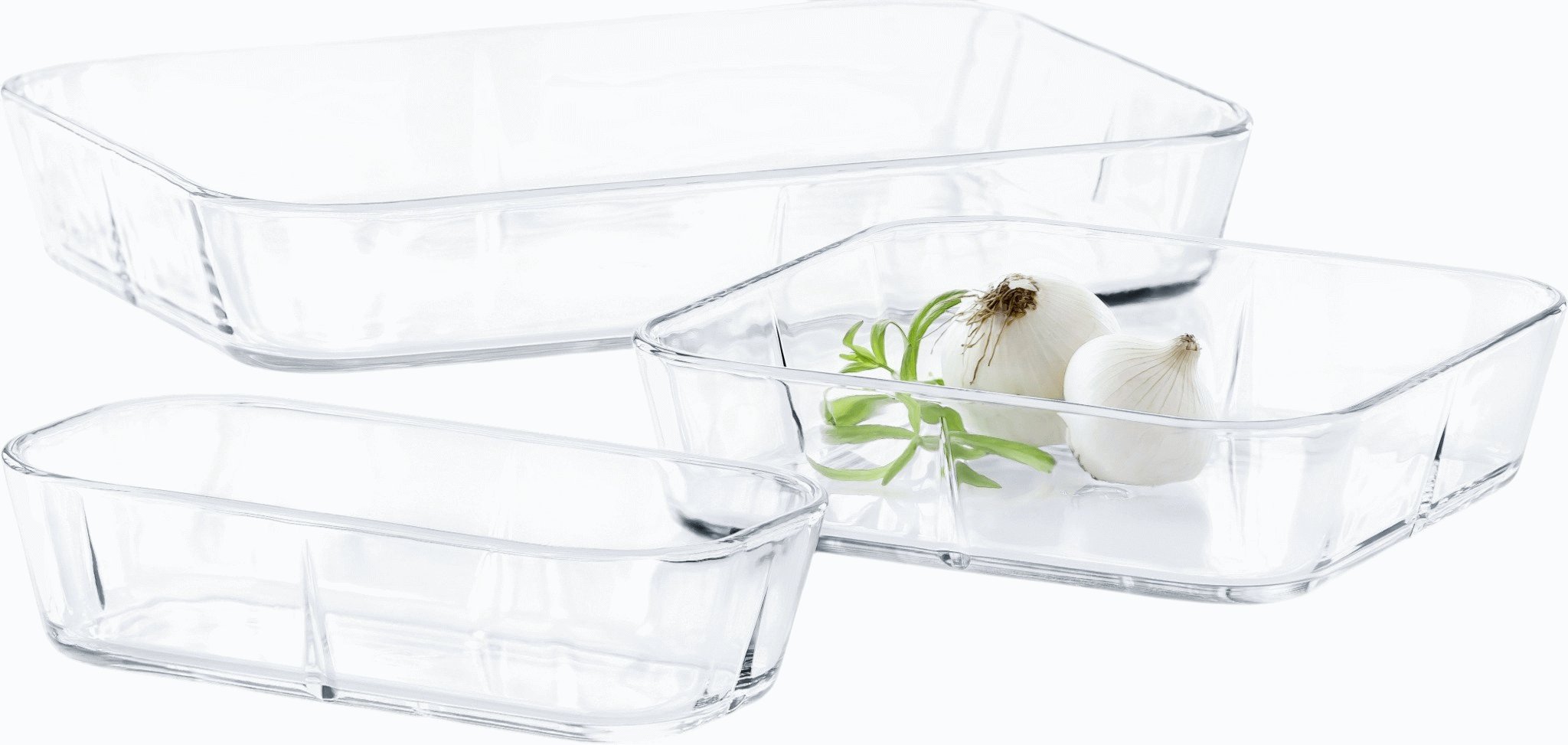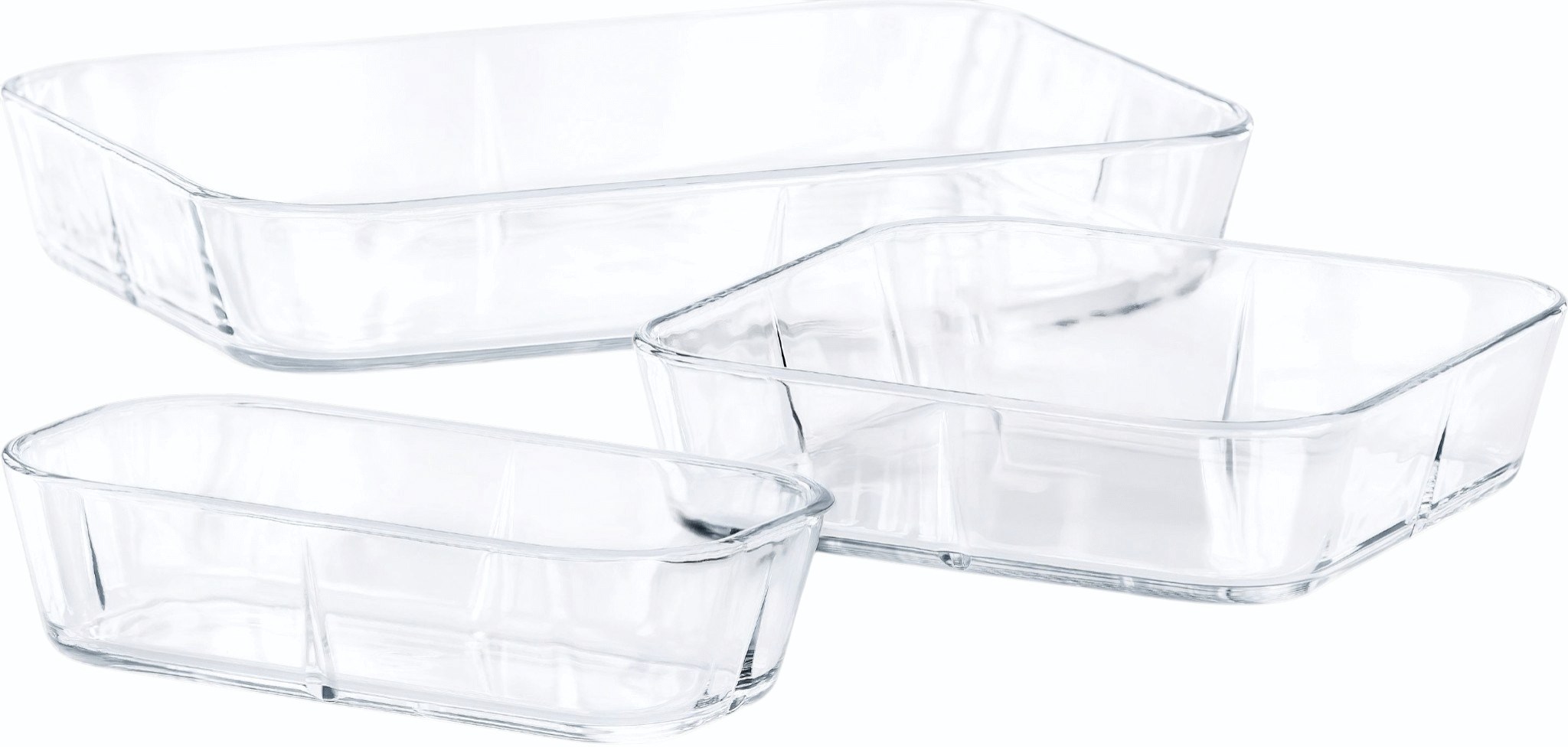 - Sæt med tre ovnfaste glasfade i forskellige størrelser