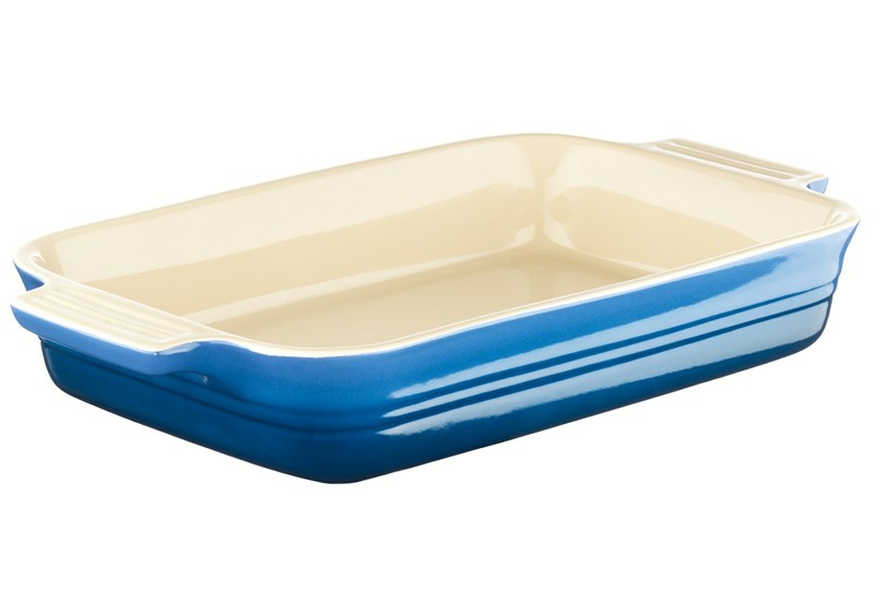 Rektangulært fad i glaseret stentøj fra Le Creuset. Det ovnfaste fad har gode håndtag som sikre et godt greb selv med grydelapper.