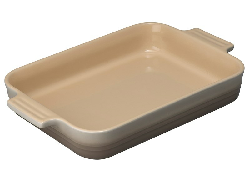 Rektangulært fad i glaseret stentøj fra Le Creuset. Det ovnfaste fad har gode håndtag som sikre et godt greb selv med grydelapper.