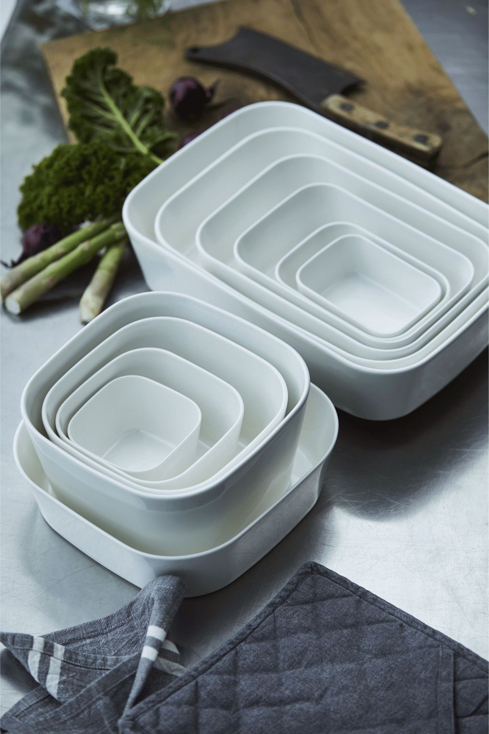 Rosti Modula Fad i hvidt porcelæn er et alsidigt og funktionelt tilbehør til det moderne skandinaviske køkken. Dette kompakte 12,5x9 cm fad kombinerer elegant design med praktisk anvendelighed, hvilket gør det til et uundværligt element i enhver madlavningsentusiasts køkkenudstyr.Fremstillet af forstærket porcelæn sikrer dette Rosti-fad enestående holdbarhed og varmebestandighed. Den robuste konstruktion tåler temperaturer op til imponerende 350 grader, hvilket giver dig frihed til at eksperimentere med forskellige ovnretter uden bekymring. De høje kanter på 4,5 cm holder effektivt på saucer og væsker, mens den rektangulære form gør det perfekt til alt fra portionsanretninger til små gratiner.