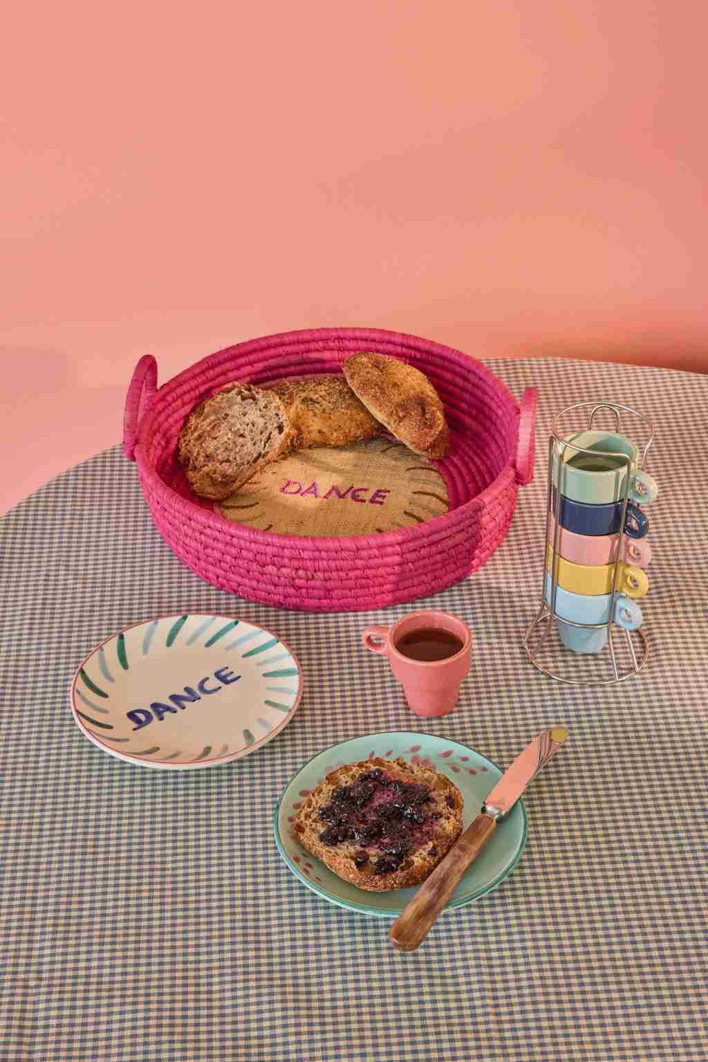 RICE brødkurv i lyserød med charmerende "Dance" broderi bringer farve og personlighed til dit hjem. Med en diameter på 26 cm og en højde på 7 cm er denne kurv ideel til at servere varmt brød ved morgenbordet, organisere små hverdagsting eller som et dekorativt element, hvor du kan style den med lys og dine yndlingsgenstande.Kurven er håndlavet af dygtige håndværkere i Madagaskar, hvilket sikrer en unik finish og autentisk karakter. Hvert stykke bærer præg af omhyggelig håndværksmæssig ekspertise, der giver produktet en særlig charme og individualitet. Det naturlige raffia-materiale giver kurven en blød tekstur og en varm, indbydende fremtoning, der passer perfekt ind i både moderne og klassiske indretningsstile.