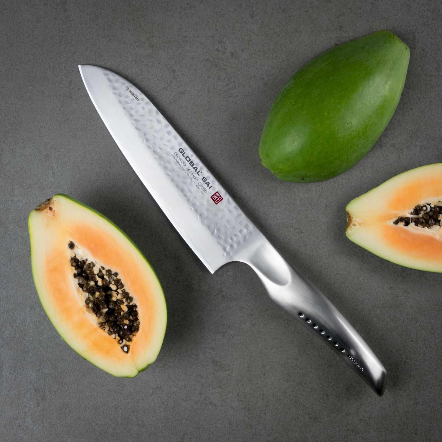 Med Global Sai Santoku Kniv får du et professionelt køkkenredskab, der forener japansk knivtradition med moderne teknologi og design.