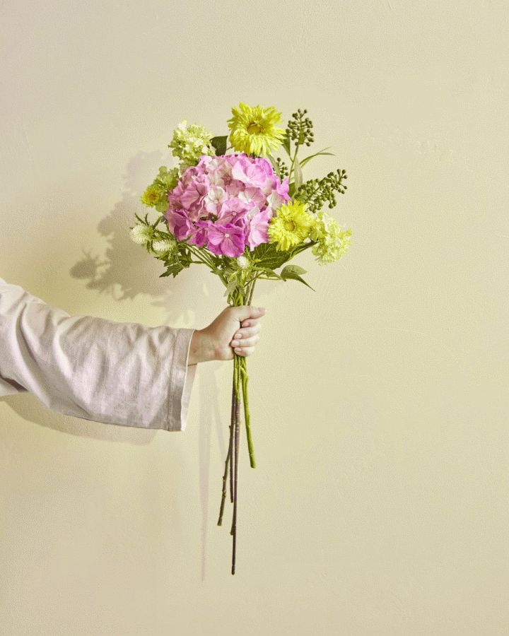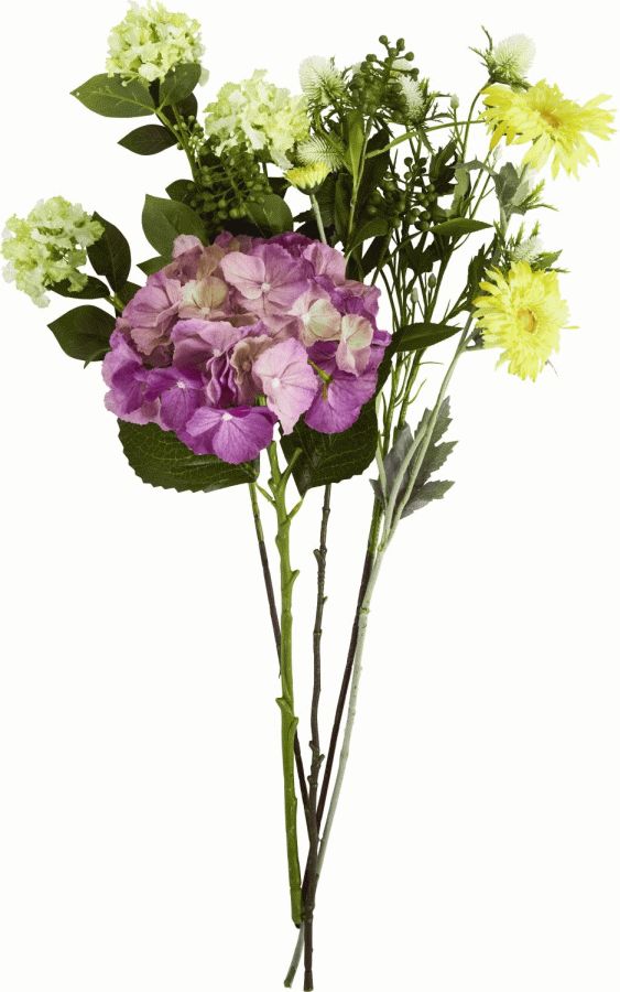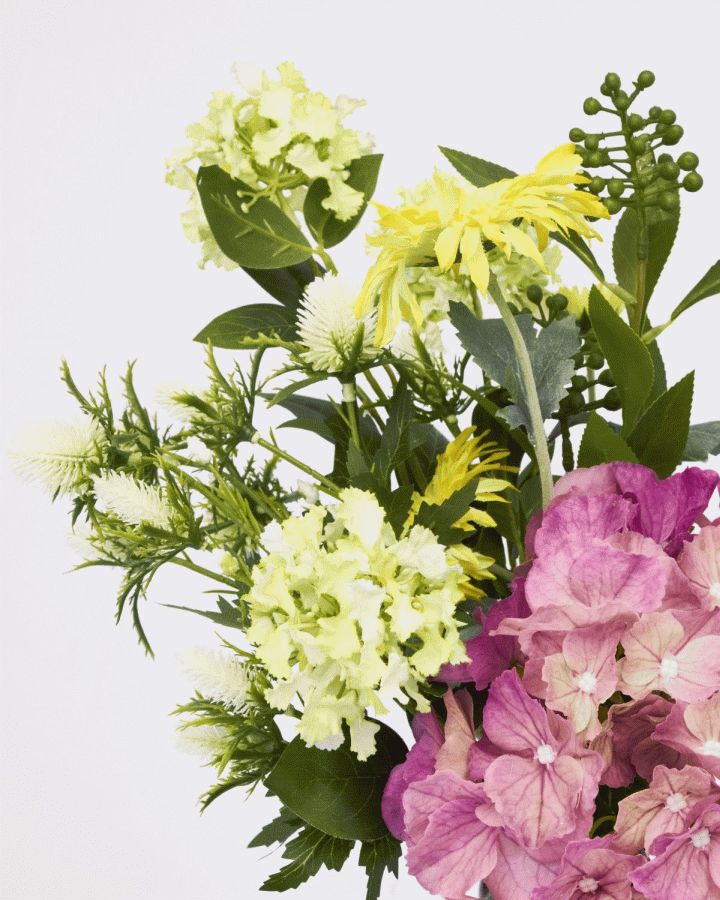 Buketten er designet med omhu og består af forskellige stilke, der hver især bidrager til et naturligt og varieret udtryk. De naturtro teksturer og den livlige farvesammensætning gør, at buketten fremstår autentisk og tilføjer personlighed til ethvert rum. Det multifarvede design gør det nemt at matche buketten med forskellige indretningsstile, uanset om dit hjem er præget af nordisk minimalisme eller en mere eklektisk tilgang.
