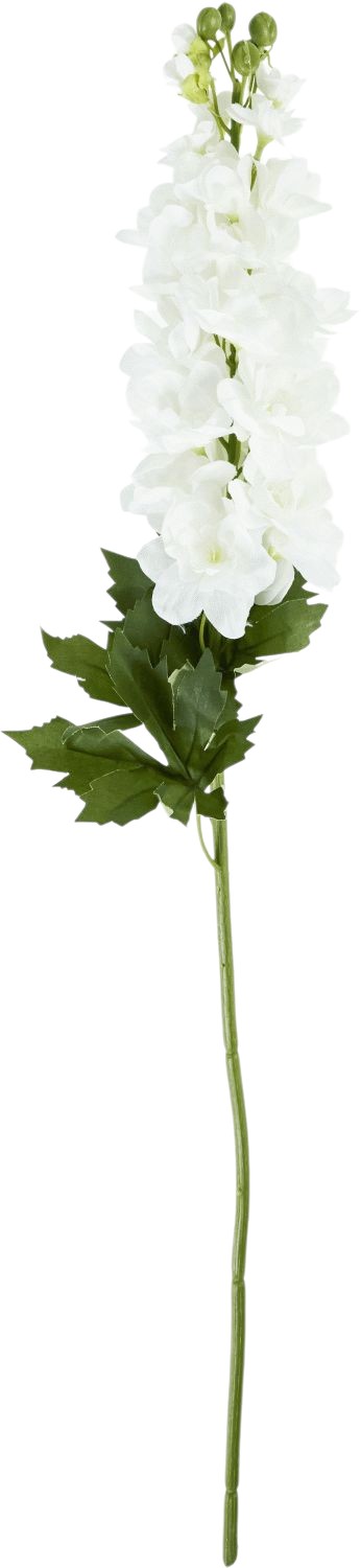 Den hvide farve giver en ren og tidløs fremtoning, der passer ind i både moderne og klassiske indretningsstile. Riddersporens karakteristiske form med de tætpakkede blomster langs stilken skaber en smuk silhuet, der tiltrækker blikket uden at dominere rummet. Med en bredde på 12 cm er den ideel til både smalle vaser og større arrangementer.