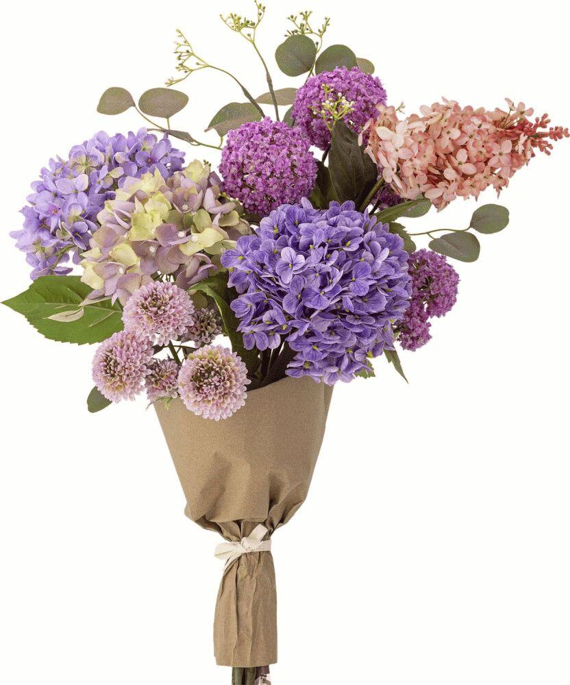 Buketten er sammensat af kunstige blomster i poly, der fremstår utroligt naturtro og levende. De lilla toner danner en harmonisk base, mens de fine rosa og lysegule accenter tilføjer dybde og variation til det samlede udtryk. Dybgrønne blade og eukalyptusgrene kompletterer arrangementet og giver buketten et autentisk og frodigt look. Hele buketten er smukt indpakket i brunt papir, hvilket giver den et rustikt og charmerende præg, der er klar til at blive præsenteret i din yndlingsvase.