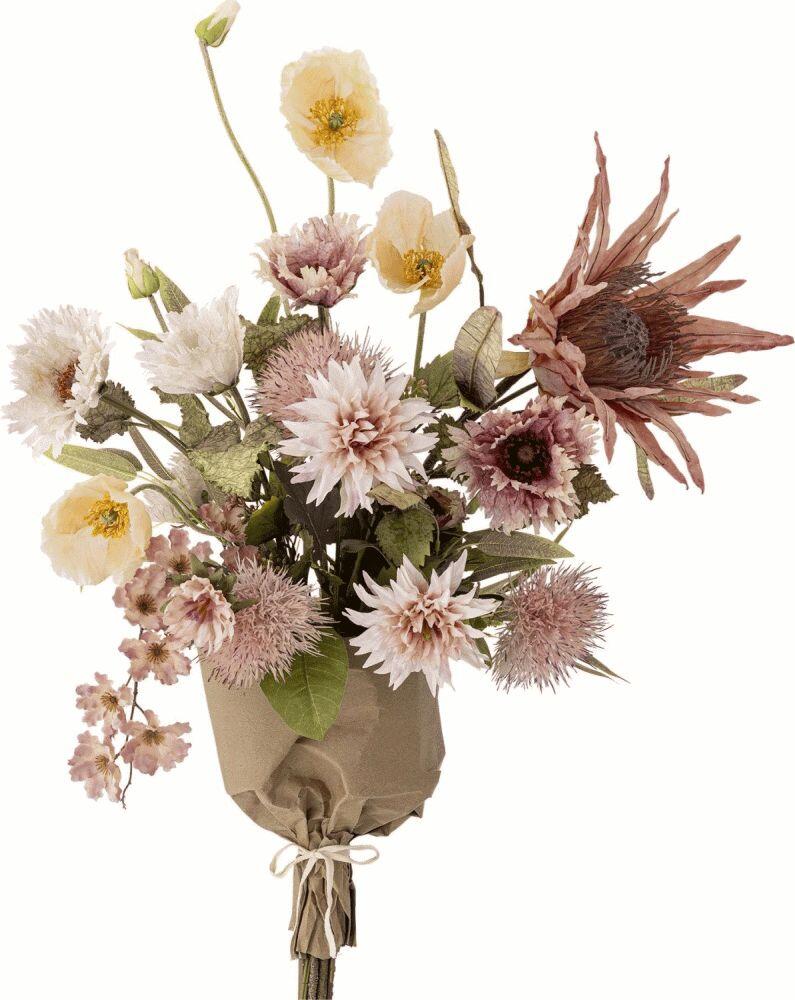 - Kunstig buket med fyldige blomster i bløde rosatoner og grønne blade