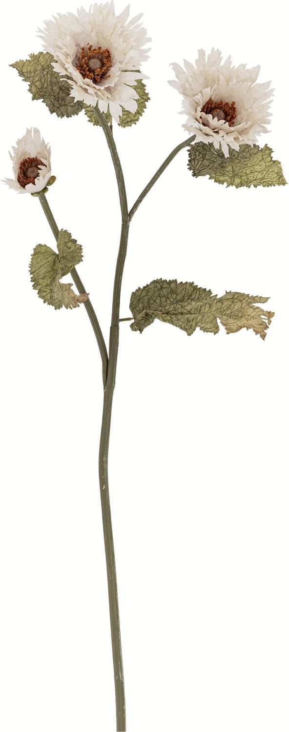 Chrysantemum Stilken fra Bloomingville bringer en naturlig elegance ind i hjemmet med sine tre bløde, hvide blomsterhoveder, der hver især er udformet med smukke, varme nuancer i midten. Den kunstige blomst er fremstillet i polyester og designet med øje for detaljen, så den næsten føles som den ægte vare. De grønne blade har en fin struktur, der giver stilken et autentisk udtryk, mens den slanke stilk sikrer, at blomsten står elegant i vasen.Med en højde på 96 cm er denne kunstige chrysantemum ideel til både høje gulvvaser og som et markant element på spisebordet eller i vindueskarmen. Den hvide farve gør den let at kombinere med andre blomster eller som et selvstændigt statement i interiøret. Blomsten kræver ingen vand eller pleje og bevarer sit smukke udseende år efter år, hvilket gør den til en praktisk løsning for dem, der ønsker grønne indslag i hjemmet uden besvær.