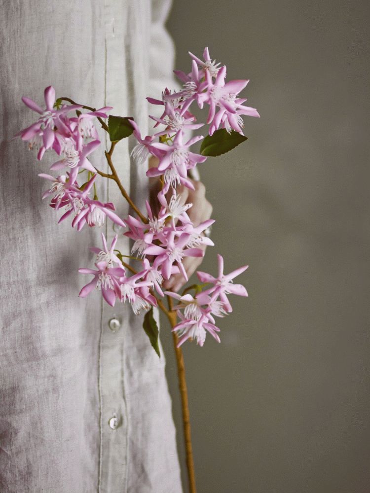 Stilken er designet med omhyggeligt udformede takkede blade, der giver et autentisk udtryk, mens de lysegule knopper tilføjer en fin kontrast til den overordnede rosa farve. Den slanke brune stilk efterligner naturens eget design og skaber en harmonisk helhed, der passer perfekt ind i skandinaviske hjem, hvor enkelhed og æstetik går hånd i hånd.