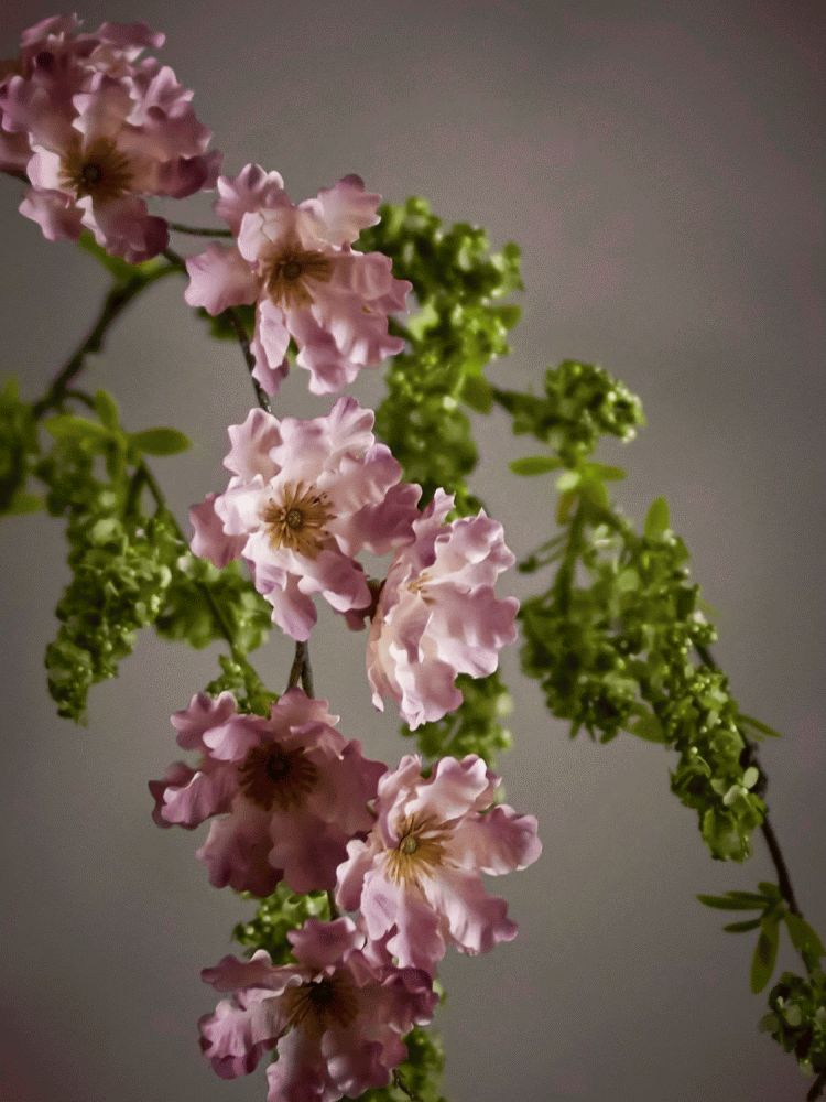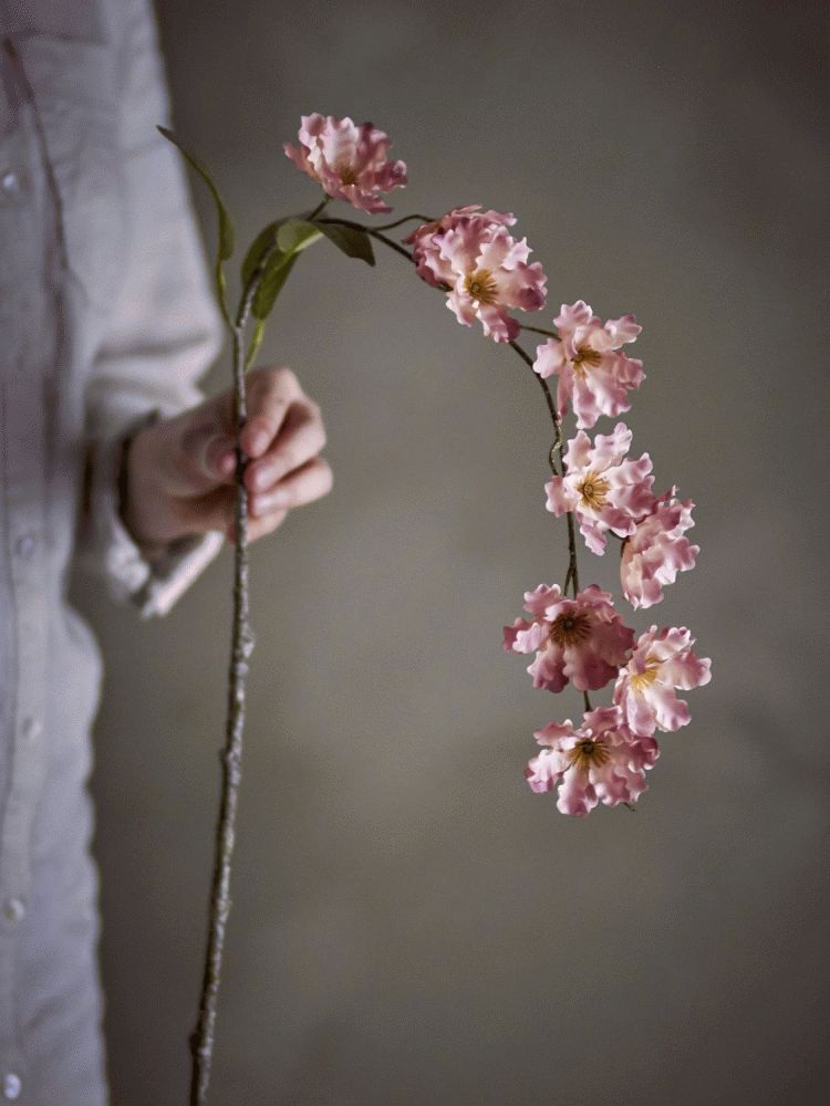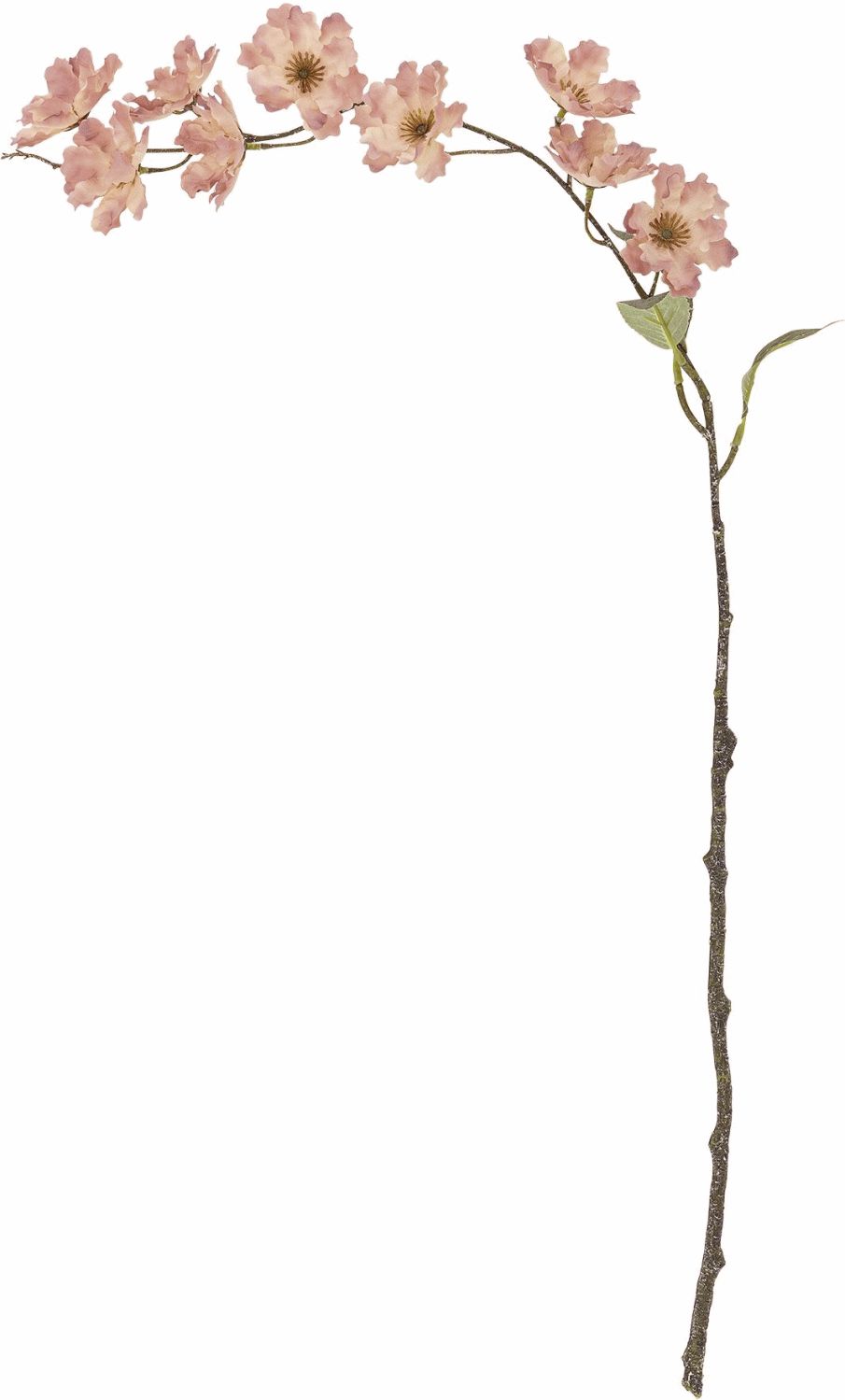 Den kunstige gren er forsynet med let krusede kronblade i fine rosanuancer, der kompletteres af varme gule centre, som skaber en naturlig kontrast og dybde i designet. De dæmpede grønne blade på den brune gren bidrager til et autentisk udtryk, der minder om naturens egen komposition. Med en højde på 90 cm og en diameter på 10 cm er stilken ideel til både høje gulvvaser og dekorative arrangementer på borde eller konsoller.