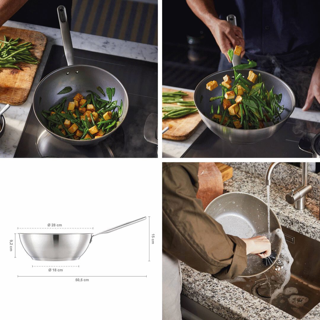 Med en diameter på 28 cm er denne wok ideel til både hverdagsmad og mere festlige anledninger. Den rummelige størrelse giver plads til at tilberede retter til hele familien, mens den alligevel er håndterbar og nem at arbejde med. Den universelle kompatibilitet betyder, at du kan bruge wokken på alle typer kogezoner, herunder induktion, gas, keramik og elektriske plader.