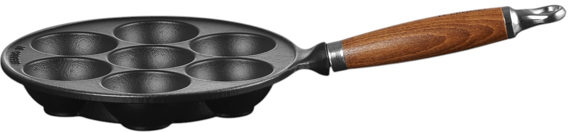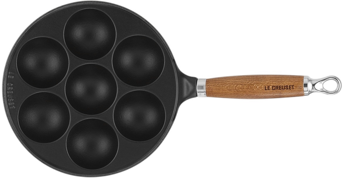 Le Creuset Æbleskivepande med træhåndtag bringer den klassiske danske tradition ind i dit køkken med et strejf af fransk kvalitet og elegance. Denne 20 cm pande i mat sort støbejern er designet til at skabe perfekte, runde æbleskiver med en sprød ydre skal og en blød, luftig midte - ikke kun til jul, men året rundt når sulten efter denne danske delikatesse melder sig.Støbejernsdesignet sikrer optimal varmefordeling og -fastholdelse, hvilket giver dig præcis den jævne varme, der er nødvendig for at opnå det perfekte resultat hver gang. Det elegante træhåndtag er ikke blot et stilfuldt designelement, men også en praktisk detalje, der forbliver køligt under madlavningen, så du trygt kan håndtere panden selv ved høje temperaturer.