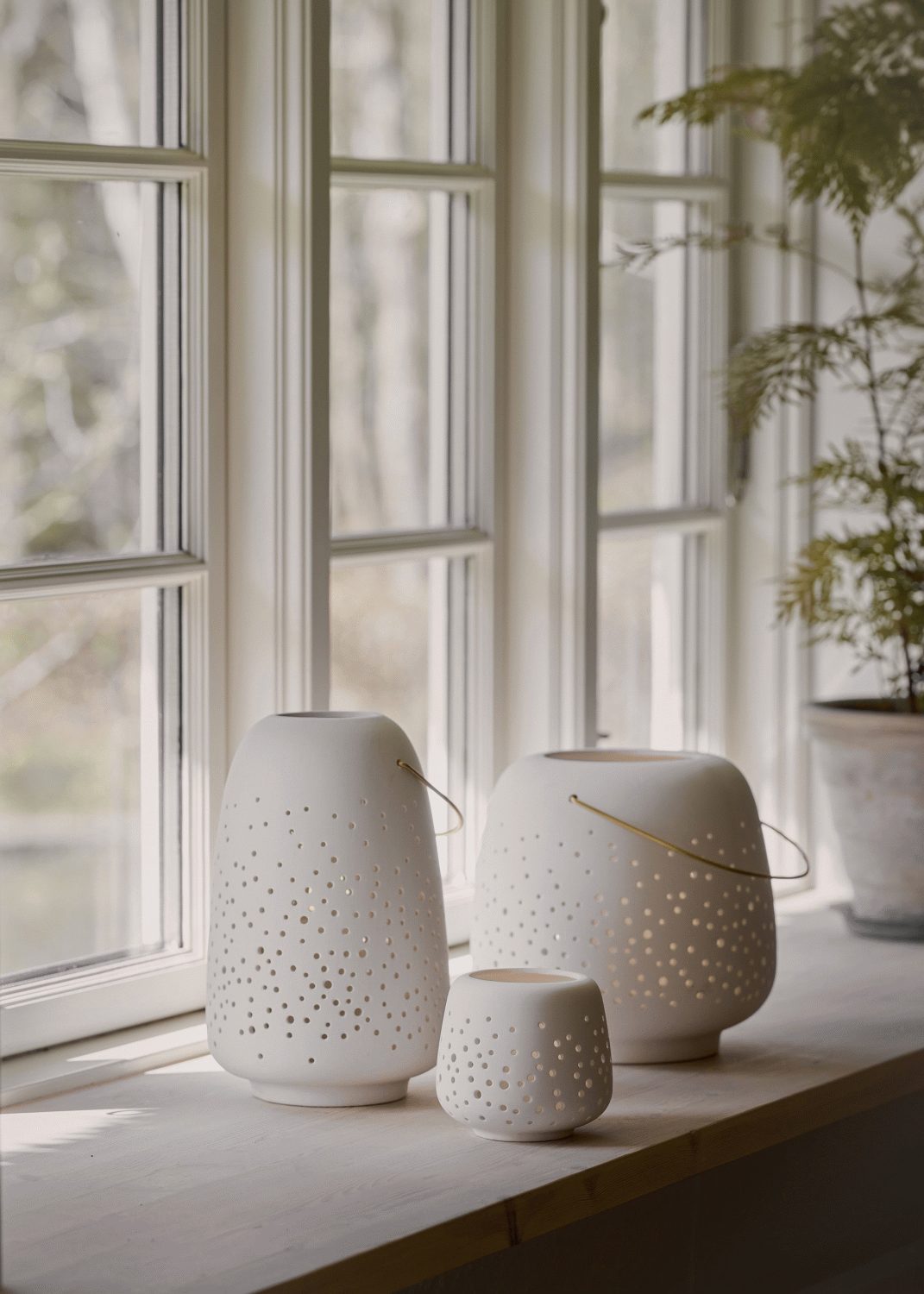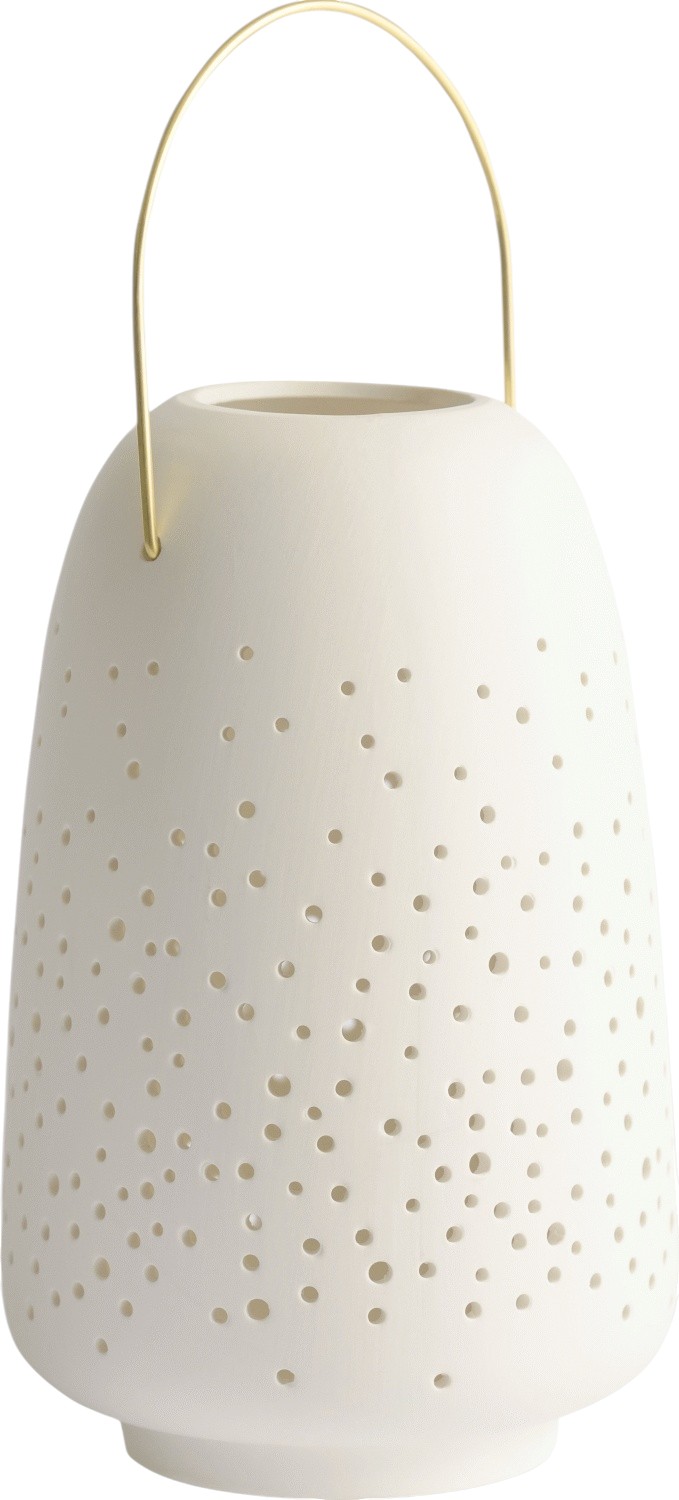 Den robuste keramikkonstruktion sikrer både holdbarhed og stilfuld præsentation, mens den hvide farve gør lanternen til et alsidigt element, der passer ind i enhver indretningsstil - fra moderne minimalistisk til klassisk skandinavisk design. Den praktiske metalhank i toppen gør det nemt at flytte lanternen rundt eller hænge den op efter behov.
