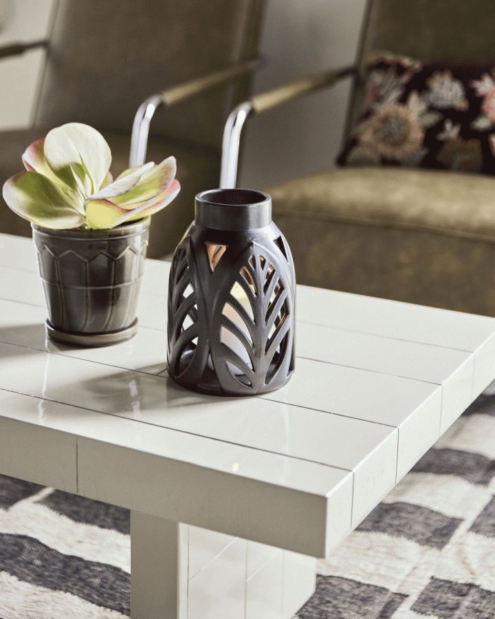 Det sorte lertøj giver lanternen en elegant og tidløs karakter, som nemt kan kombineres med forskellige indretningsstile. Det botaniske mønster er omhyggeligt udskåret og tilføjer en kunstnerisk dimension til designet. Når mørket falder på, og lyset fra et stearinlys eller LED-lys bryder gennem de fine detaljer, skabes der en varm og indbydende atmosfære i rummet.