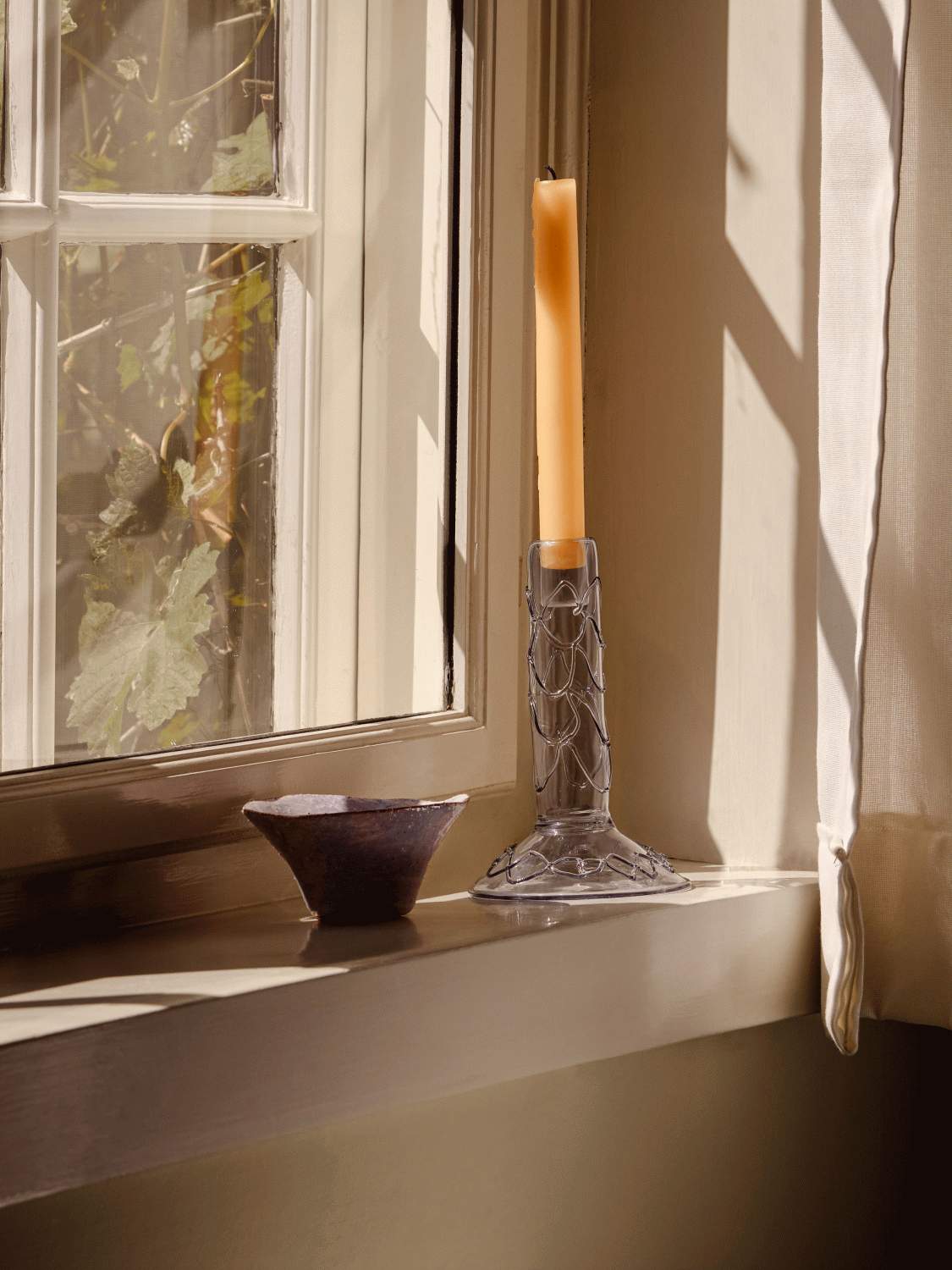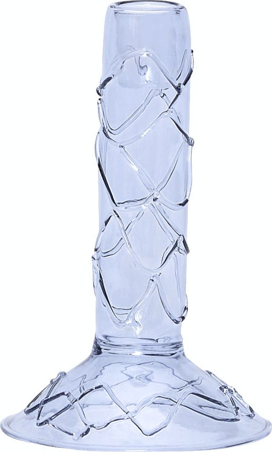 Lysestagen er fremstillet i glas med en karakteristisk tekstureret overflade, der fanger og reflekterer lyset på en særlig måde. Når stearinlyset tændes, spredes skæret blødt gennem glassets struktur og skaber en varm glød, der giver rummet liv og personlighed. Den organiske formgivning med sine bløde kurver og asymmetriske linjer gør hver lysestage til et unikt udtryk, der kombinerer funktionalitet med skulpturel æstetik.