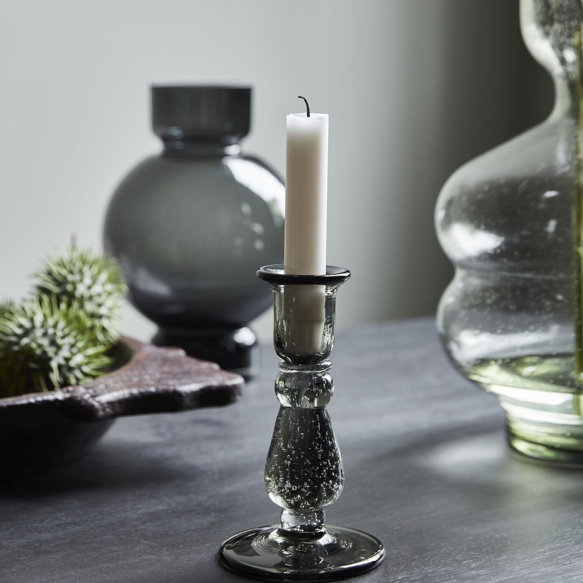 Stilfuld, klassisk og funktionel. Denne glaslysestage passer med sin tidløse form og rolige grå farve ind i enhver boligindretning. House Doctor har designet Glee med små luftbobler for at skabe balance og subtile detaljer i det tunge glas. Placer din lysestage i vindueskarmen sammen med den højere version, og gør displayet personligt ved at kombinere det med andre materialer. En anden mulighed er at fremhæve de lette luftbobler ved at sætte lysestagen sammen med vaser i samme design. Med diskrete detaljer og et klassisk design vil den hurtigt blive en favorit. Lysestagen er håndlavet, og finish, størrelse og farve kan derfor variere.Vedligeholdelse: Tørres over med en fugtig klud
