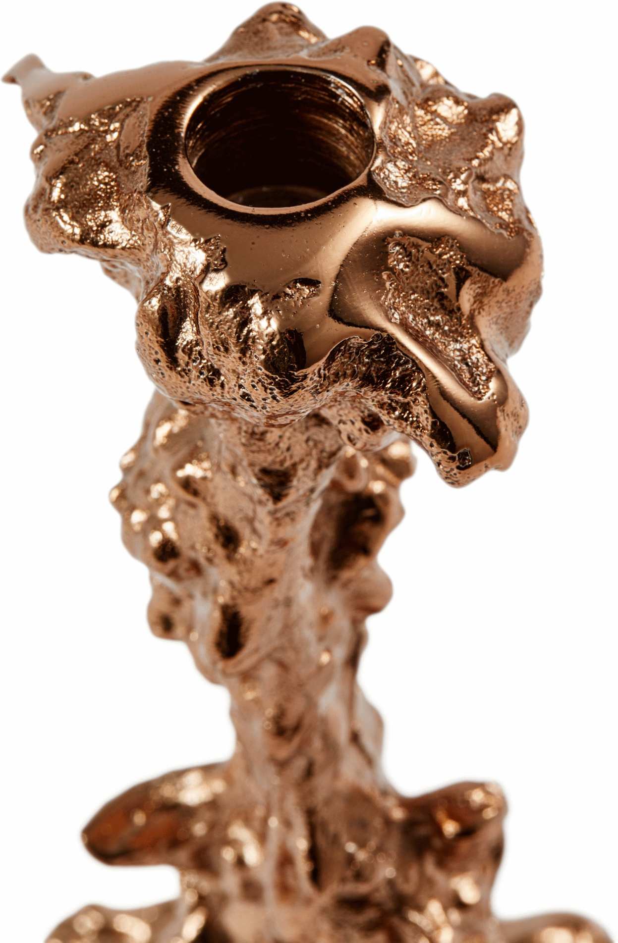 Den karakteristiske form med sine bløde bøjninger og skulpturelle kurver gør hver Drip lysestage helt unik. Det forkromede aluminium i rose gold skaber en varm, metallisk glød, der reflekterer lyset på den mest forførende måde. Når lysestagen placeres på kaminhylden, fungerer den som et selvstændigt dekorativt element, mens den på middagsbordet bliver det naturlige centrum for hygge og samvær.