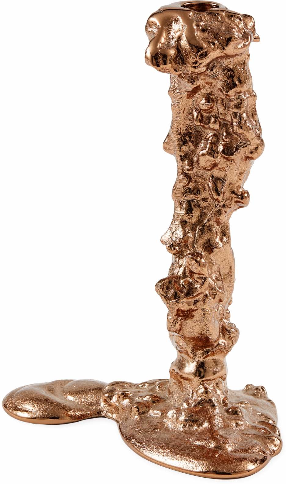 POLSPOTTEN Drip lysestage bringer teatralsk elegance ind i hjemmet med sin dramatiske silhuet og luksuriøse rose gold finish. Designet af Pascal Smelik, der har en særlig forkærlighed for det uperfekte og organiske, står denne lysestage som et sandt kunstværk, der formår at fange opmærksomheden uanset placering.Den karakteristiske form med sine bløde bøjninger og skulpturelle kurver gør hver Drip lysestage helt unik. Det forkromede aluminium i rose gold skaber en varm, metallisk glød, der reflekterer lyset på den mest forførende måde. Når lysestagen placeres på kaminhylden, fungerer den som et selvstændigt dekorativt element, mens den på middagsbordet bliver det naturlige centrum for hygge og samvær.