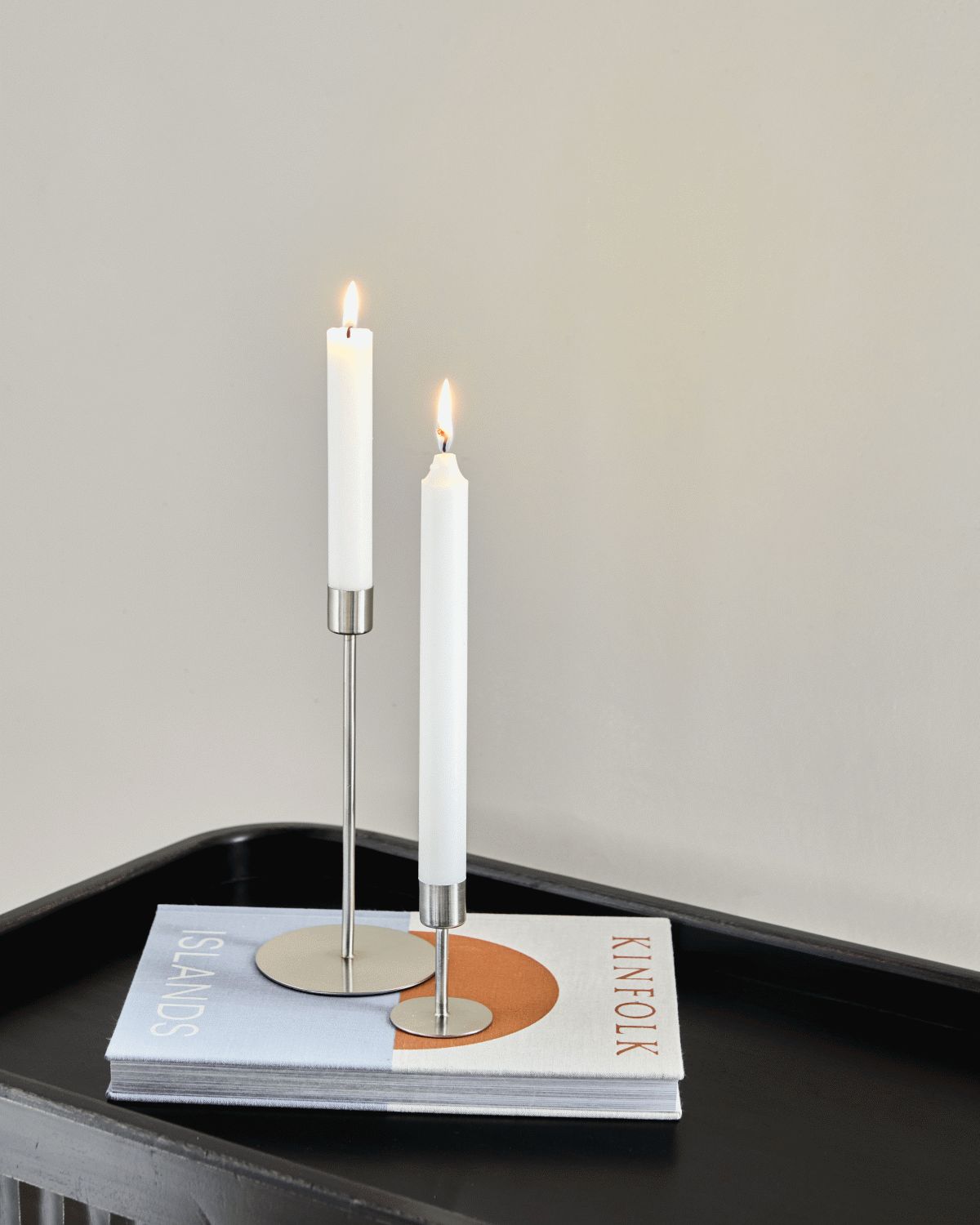 Lysestagen er fremstillet i solid jern, der sikrer stabilitet og holdbarhed. Den elegante sølvfinish giver overfladen et diskret skær, som fanger lyset på en smuk måde uden at dominere rummet. Med sin kompakte størrelse på 7 cm i højden og 5 cm i diameteren passer Anit lysestagen perfekt på både smalle hylder, vindueskarme og større borde, hvor den kan stå alene eller arrangeres sammen med andre lysestager i forskellige størrelser for at skabe dybde og variation.