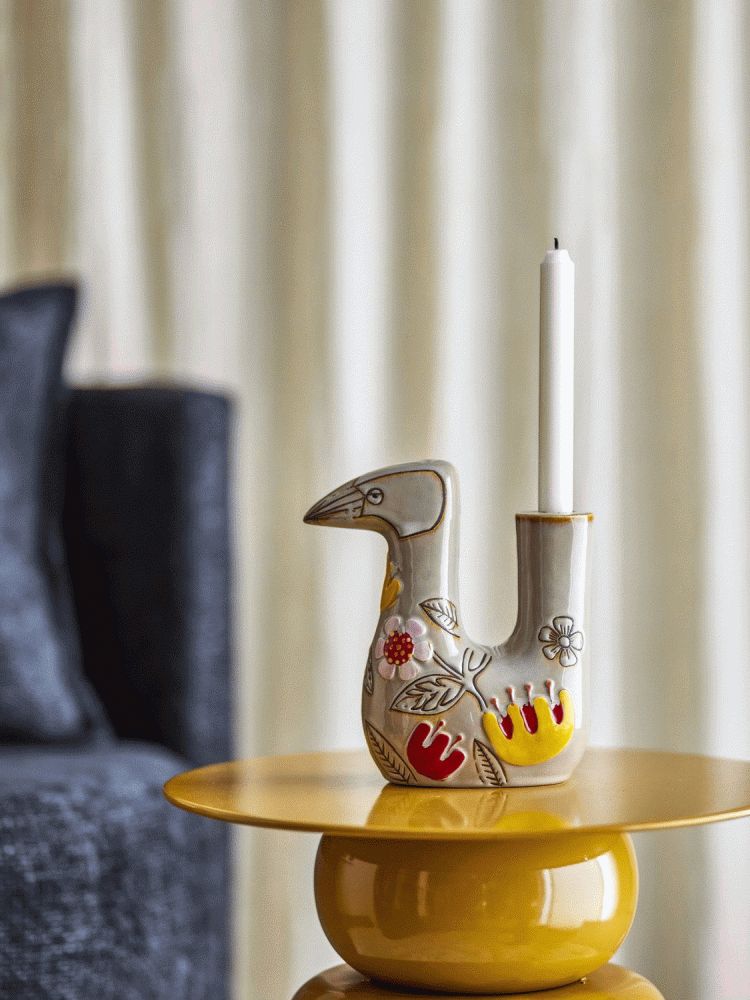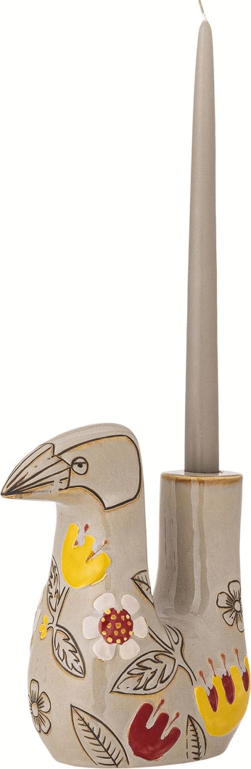 Vivielle Lysestagen fra Bloomingville bringer liv og farve ind i hjemmet med sit charmerende fugledesign. Denne dekorative lysestage er formet som en elegant fugl og fremstillet i solidt stentøj, der sikrer både holdbarhed og æstetisk kvalitet. Det er et stykke, der naturligt tiltrækker opmærksomhed og skaber samtale i ethvert rum.Lysestagen udmærker sig med sin flerfarvede overflade, hvor blomsterdetaljer er omridset i sort for at skabe kontrast og dybde i designet. Den kunstneriske udførelse giver produktet et levende udtryk, der passer perfekt til både moderne og klassiske indretningsstile. Fugleformen tilføjer en legende dimension til den traditionelle lysestage og gør den til mere end blot en funktionel genstand – den er også et dekorativt element i sig selv.