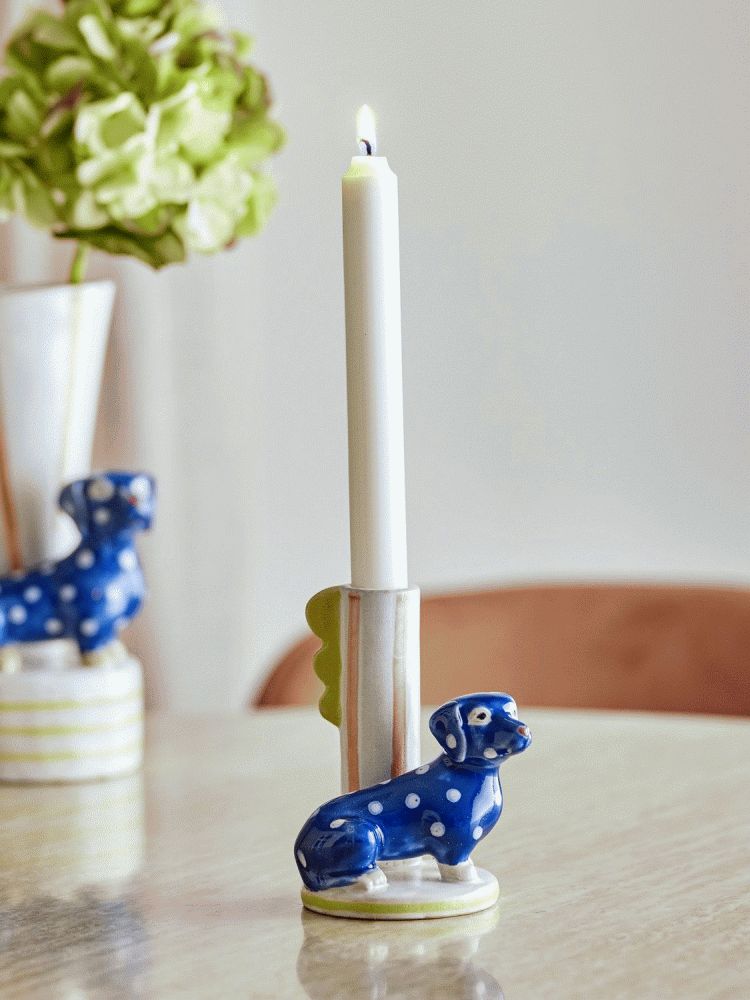 Denne charmerende lysestage fra Bloomingville bringer personlighed og humor ind i hjemmet med sin unikke udformning som en gravhund. Dachsy Lysestagen er fremstillet i stentøj og dekoreret med en håndmalet finish, der gør hver enkelt lysestage til et individuelt kunstværk. Den legende og farverige gravhund passer perfekt ind i både moderne og eklektiske indretninger, hvor den tilføjer et sjovt og personligt præg.Den håndmalede finish giver lysestagen et levende udtryk med en dyb blå grundfarve, der er prikket med hvide detaljer. Små accenter i beige, gul, orange og rosa fremhæver gravhundens ansigtstræk og krop, hvilket skaber en varm og indbydende æstetik. Fordi hver lysestage males i hånden, vil der naturligt forekomme små variationer i mønster og farveintensitet. Disse variationer er med til at understrege det håndværksmæssige udtryk og sikrer, at din lysestage er helt unik.