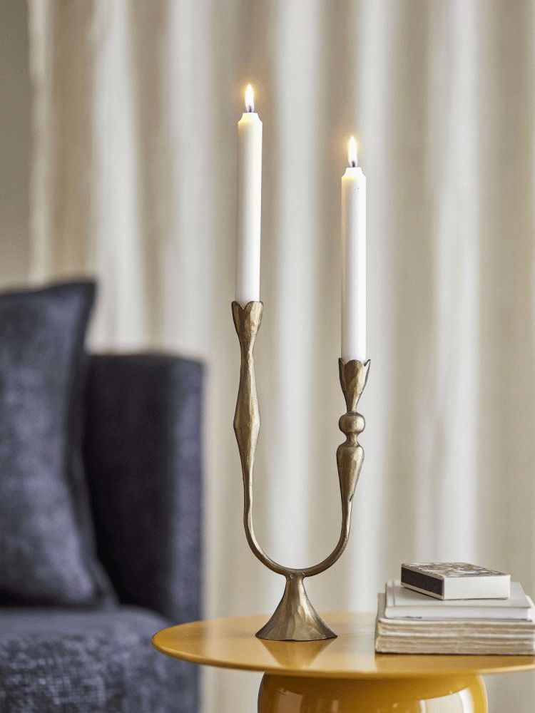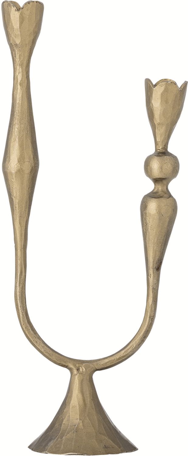 Vesc Lysestagen fra Bloomingville forener skulpturel elegance med funktionel enkelhed i et design, der tiltrækker blikket og skaber atmosfære i hjemmet. Med sine to tulipanformede holdere, der forbindes af en elegant buet base og en diskret udsvajet fod, fremstår lysestagen som et smukt kunstværk, der løfter enhver overflade den placeres på.Lysestagen er fremstillet i robust jern med en messingbelagt overflade, der giver den et varmt og eksklusivt udtryk. Den spejlblanke finish reflekterer lyset på en måde, der skaber dybde og dimension i rummet, mens den skulpturelle form understreger den omhyggelige balance mellem materiale og konstruktion. Dette er et produkt, hvor hvert detalje er nøje gennemtænkt for at skabe en harmonisk helhed.