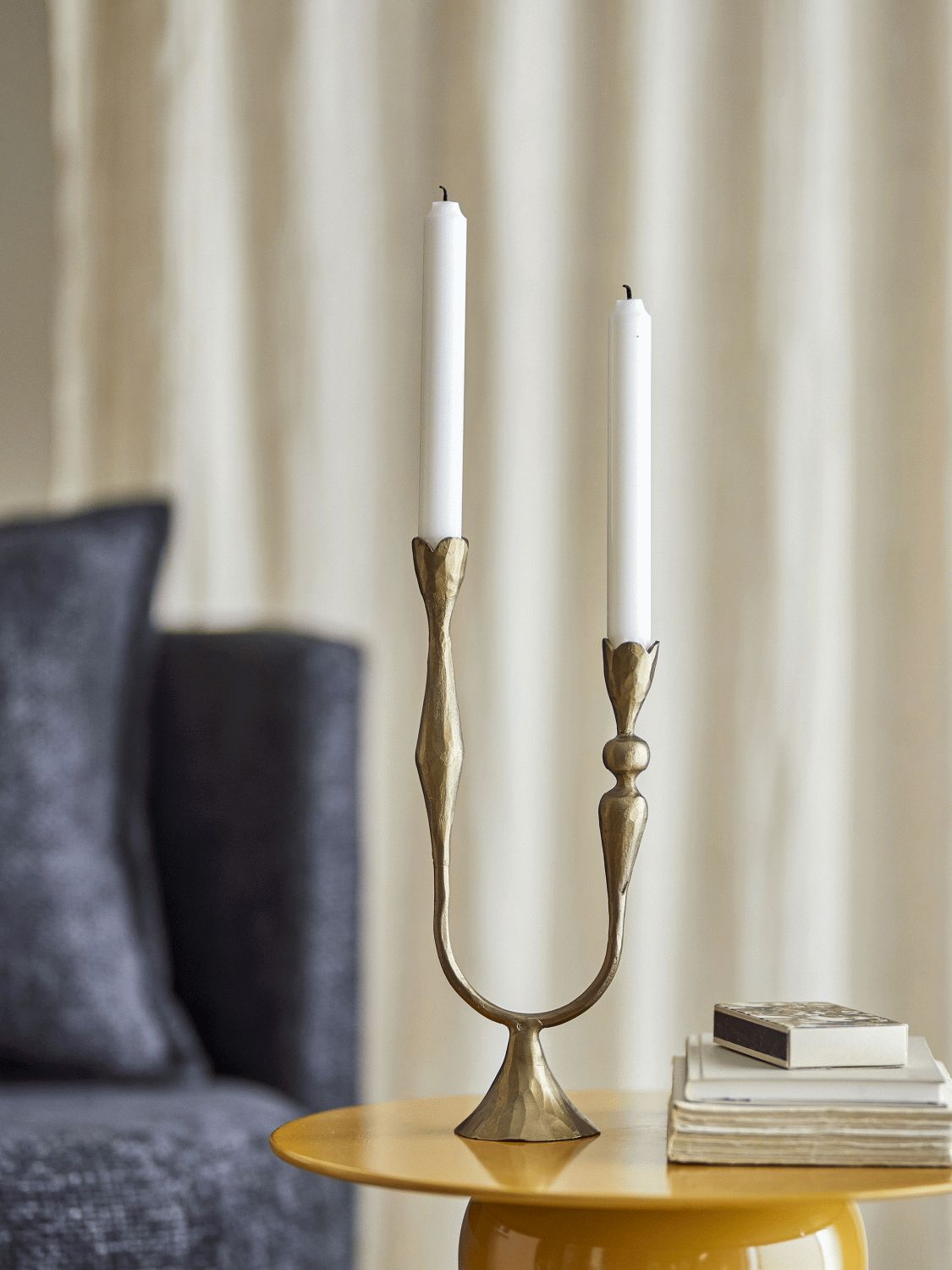 Lysestagen er fremstillet i robust jern med en messingbelagt overflade, der giver den et varmt og eksklusivt udtryk. Den spejlblanke finish reflekterer lyset på en måde, der skaber dybde og dimension i rummet, mens den skulpturelle form understreger den omhyggelige balance mellem materiale og konstruktion. Dette er et produkt, hvor hvert detalje er nøje gennemtænkt for at skabe en harmonisk helhed.