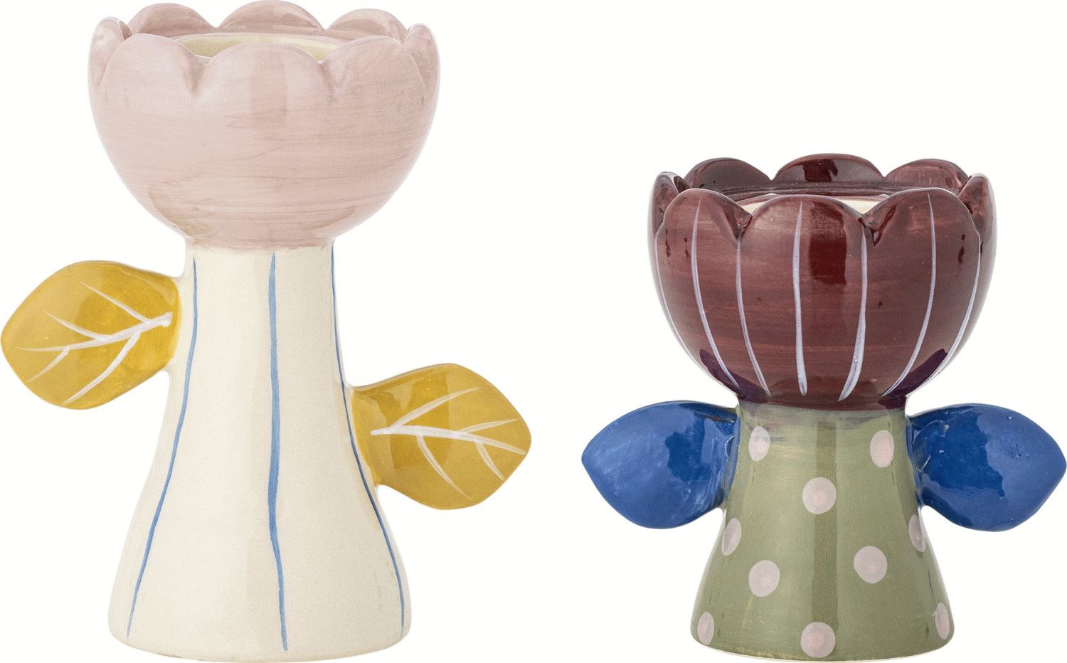 Bloomingville Florita Lysestage bringer en charmerende og kunstnerisk atmosfære ind i hjemmet med sit håndmalede design og bløde farvepalette. Dette sæt består af to lysestager i stentøj, der hver især udmærker sig ved deres unikke udtryk og detaljerede udsmykning. De bølgede kanter giver lysestagerne en legende silhuet, mens de håndmalede blomstermotiver og prikker i dæmpede toner skaber en indbydende og personlig karakter.Stentøj er et robust og holdbart materiale, der sikrer lysestagerne en lang levetid, samtidig med at det giver en naturlig og autentisk overflade. Den håndmalede finish betyder, at hver lysestage er individuel med små variationer i mønster og farvestyrke, hvilket gør dem til unikke elementer i indretningen. Denne håndværksmæssige tilgang tilfører produktet en ekstra dimension af kvalitet og personlighed.