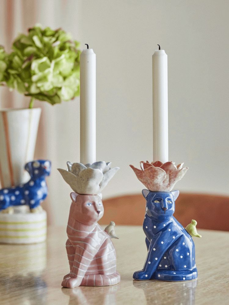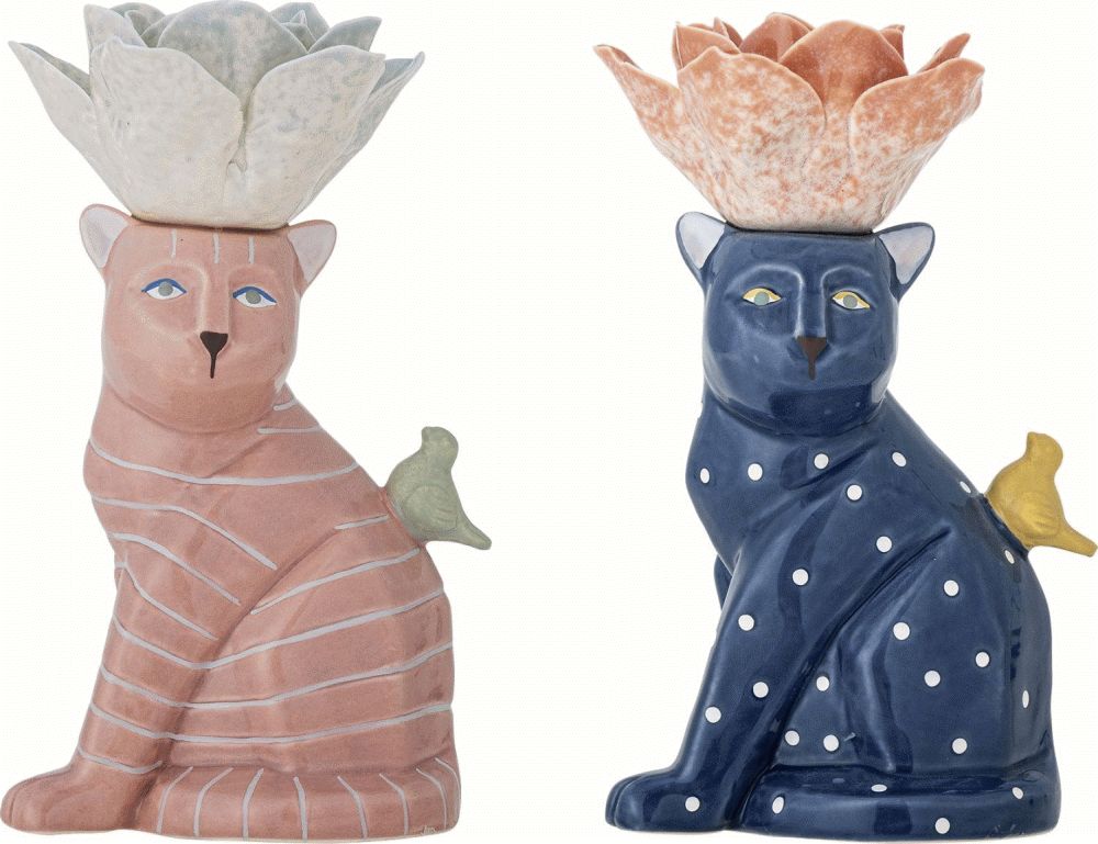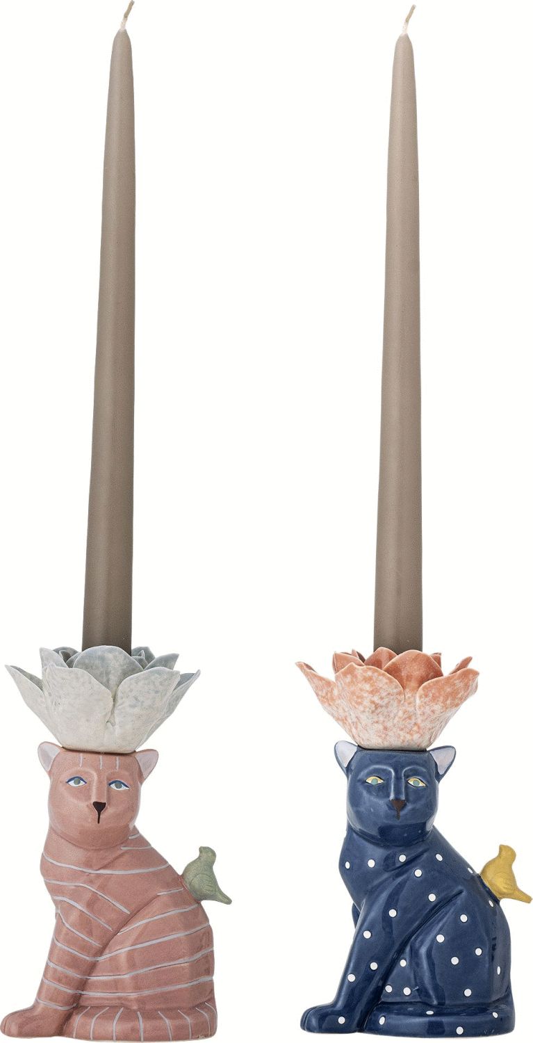 Denne charmerende lysestage fra Bloomingville bringer liv og personlighed til ethvert rum med sin kreative og legende formgivning. Settet består af to lysestager i stentøj, der hver især er formet som en kat med en blomsterformet top og en lille fugledetalje, som tilføjer et ekstra lag af finesse og charme til designet.Lysestagerne er fremstillet i stentøj og behandlet med reaktiv glasur, hvilket giver dem en dyb og levende overflade med et unikt udtryk. De håndmalede detaljer i flere farver skaber en kunstnerisk dimension, der gør hver lysestage til et lille kunstværk i sig selv. Takket være den reaktive glasur og den håndmalede finish kan der forekomme små variationer i både mønster og farvestyrke, hvilket sikrer, at ingen to lysestager er helt ens. Dette gør dem til unikke stykker, der hver især har sin egen karakter.