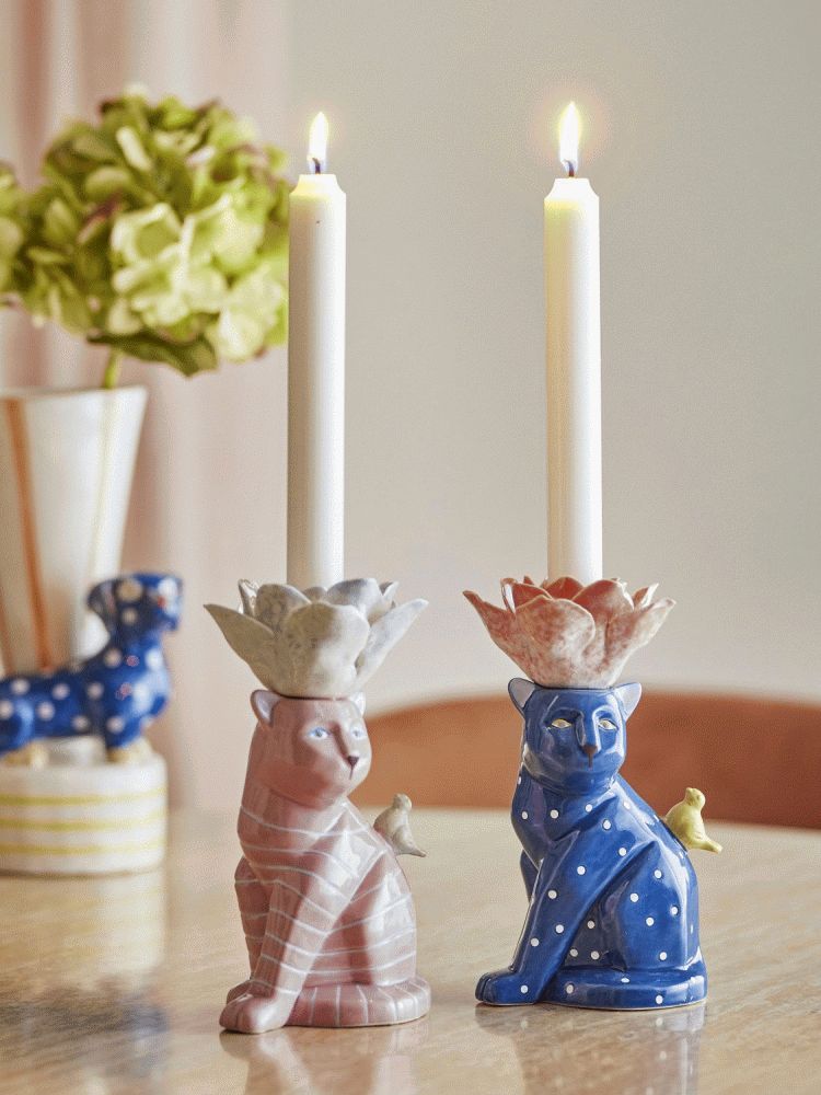 - Sæt med to lysestager i stentøj formet som katte med blomsterformet top