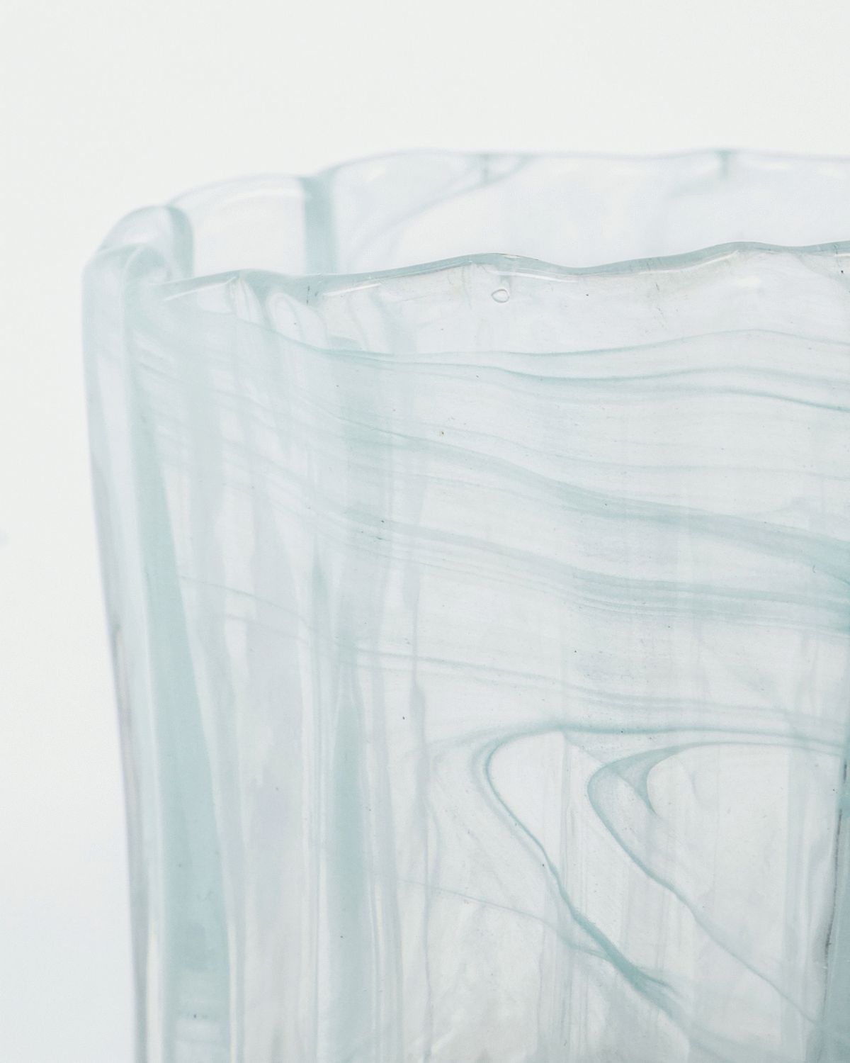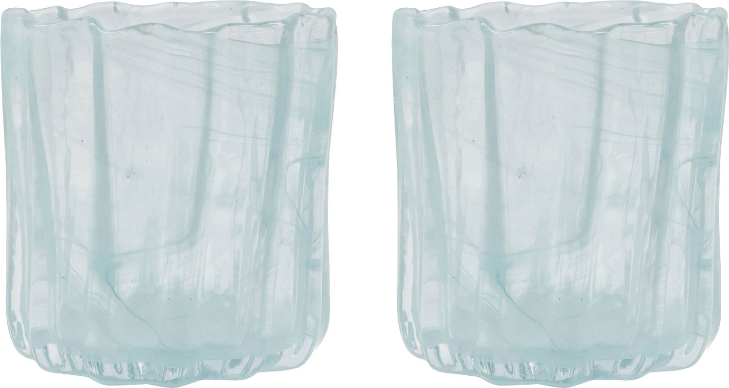 Det tykke glas er udført med et blødt, marmoreret mønster i en lys blå nuance, der giver stagerne et elegant og moderne udtryk. Når fyrfadslysene tændes, spredes lyset gennem det marmorerede glas og skaber en behagelig og stemningsfuld atmosfære i rummet. De kurvet-riflede detaljer forstærker lysets spil og tilføjer dybde til designet.