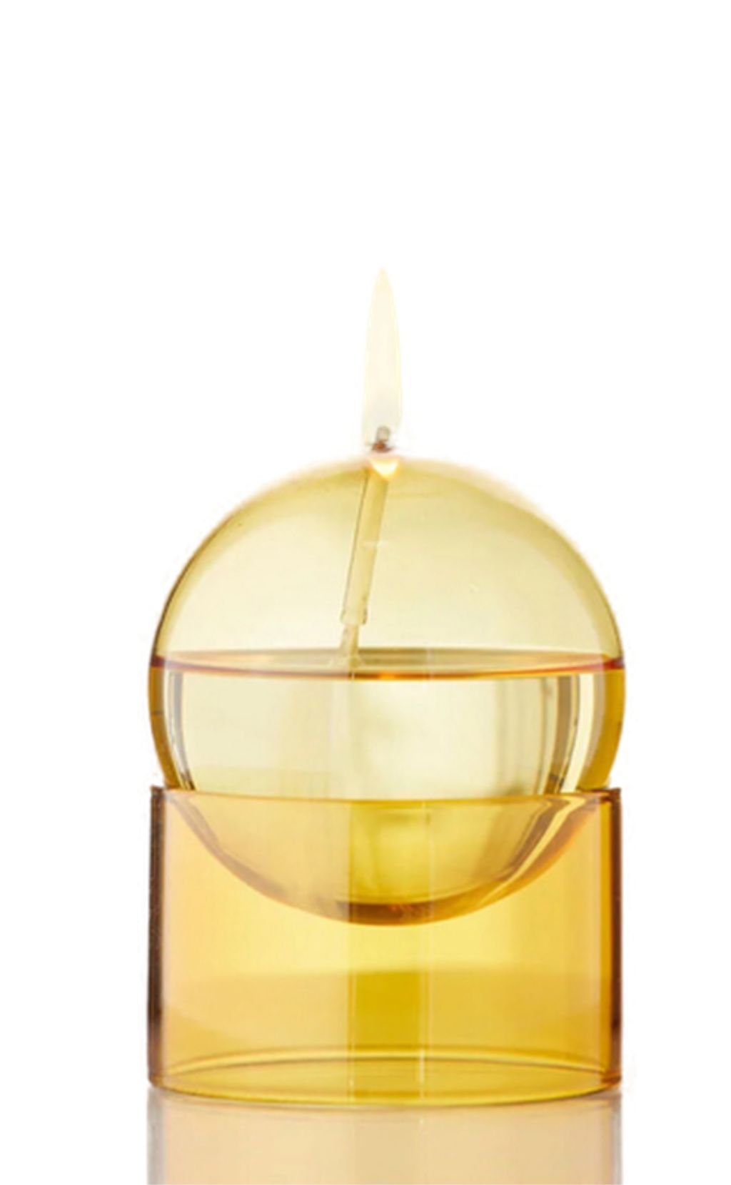 Kollektionen OIL BUBBLES er lavet i gennemfarvet glas og består af en rund glaskugle, der svæver på en farvet glasstand. Hver kombination af farverne skaber et unikt præg til indretningen. Denne variant består af en fin, gul boble, svævende på en glasstand i samme gule farve. Olielysene er designet af arkitekt Mikkel Lang Mikkelsen. Olielyset fyldes med lampeolie med den dertilhørende lille tragt.Når du køber et olielys medfølger dette: Rund boble og glasstand i farven gul, tragt til påfyldning af olie, 2 væger med brændetid på over 1000 timer pr stk, et lille glasrør til at holde vægen.