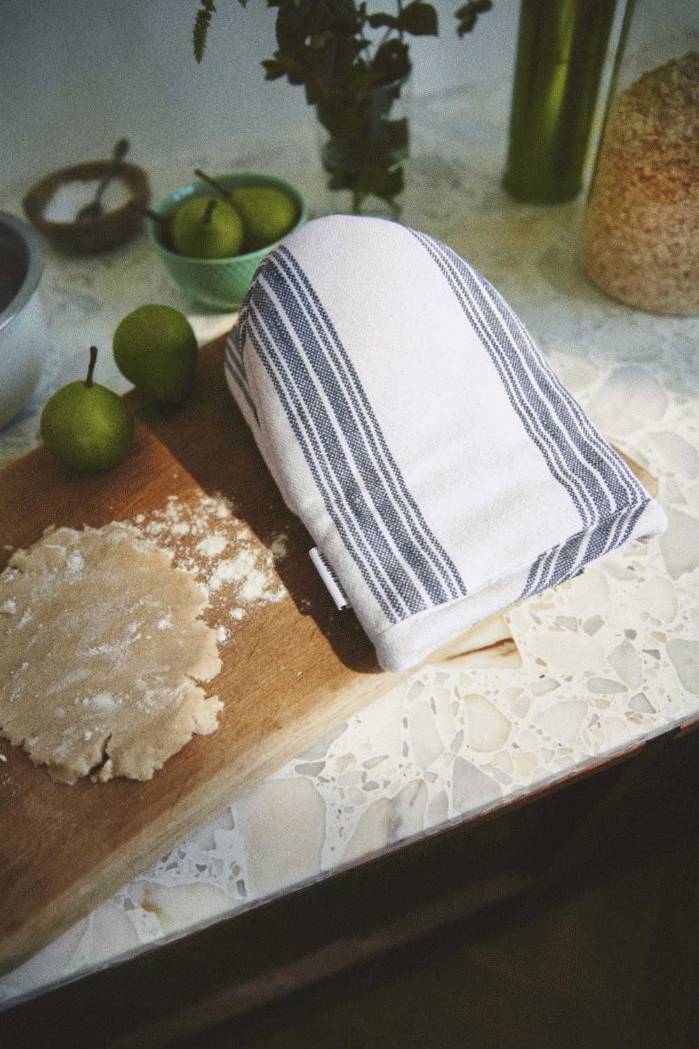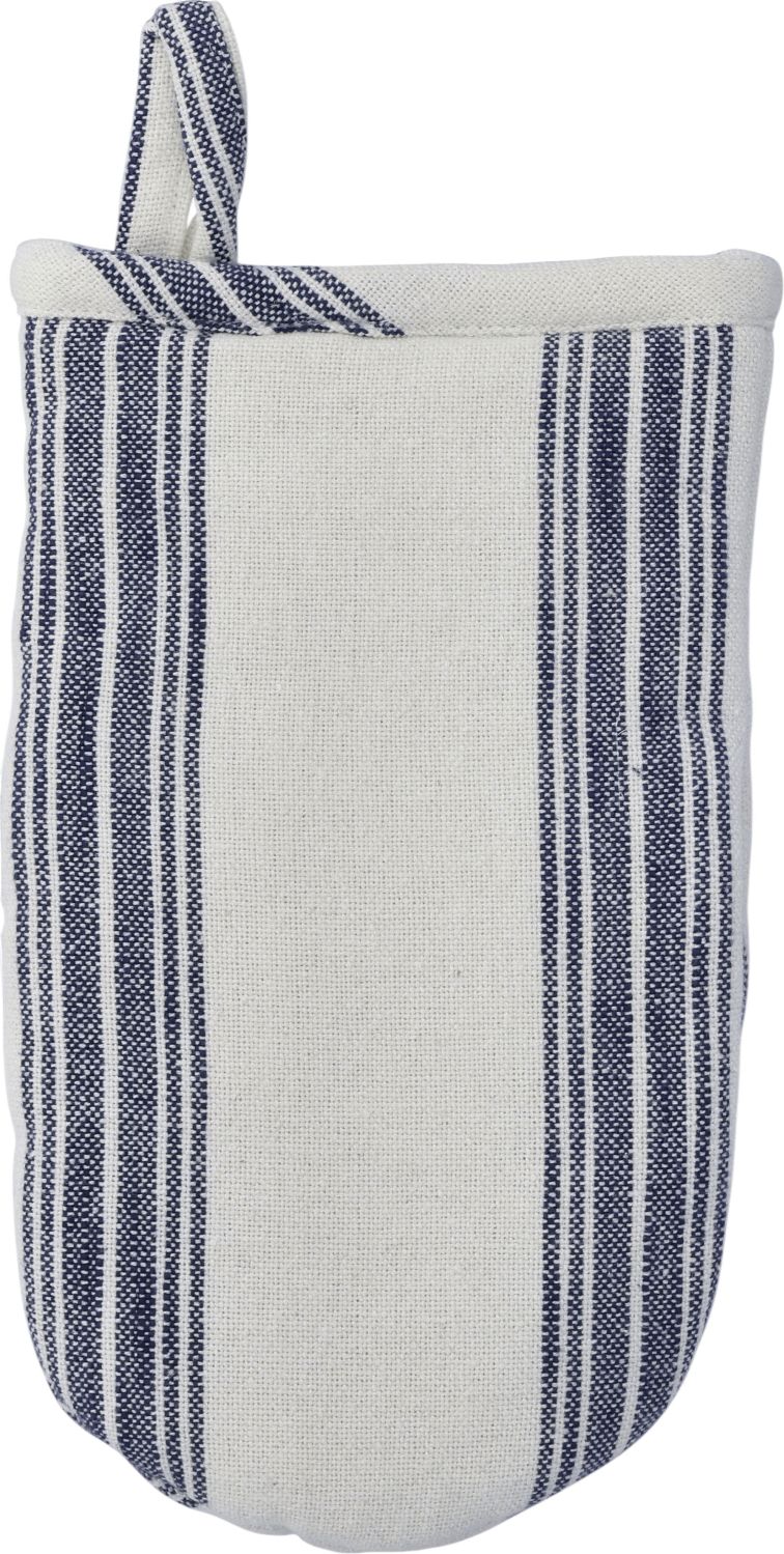 Ovnhandsken er designet til at være både praktisk og dekorativ. Den varme hvide base med blå striber skaber en visuel sammenhæng i køkkenet, uanset om den hænger på knagen, ligger på kogeøen eller er i aktiv brug under madlavningen. Det tidløse stribet design gør den nem at kombinere med andre tekstiler i køkkenet.