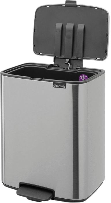 Brabantia har designet Bo med bæredygtighed i fokus - inderspanden er fremstillet af 100% genanvendt plastik, og produktet er Cradle-to-Cradle certificeret på Bronze niveau. Den skridsikre base beskytter gulvet mod ridser og sikrer, at spanden står stabilt.
