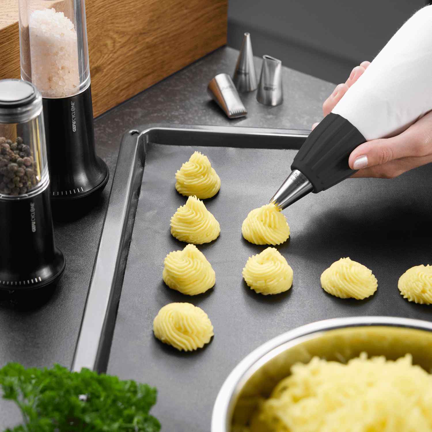GEFU er kendt for at levere køkkenredskaber, der kombinerer funktionalitet med gennemtænkt design. Dette tyllesæt er ingen undtagelse – det er skabt til både den entusiastiske hobbykok og den mere erfarne bager, der ønsker at tilføje et professionelt præg til deres kreationer. Sættet gør det muligt at arbejde præcist og effektivt, uanset om du dekorerer en simpel kagekrans eller skaber avancerede dessertanretninger.