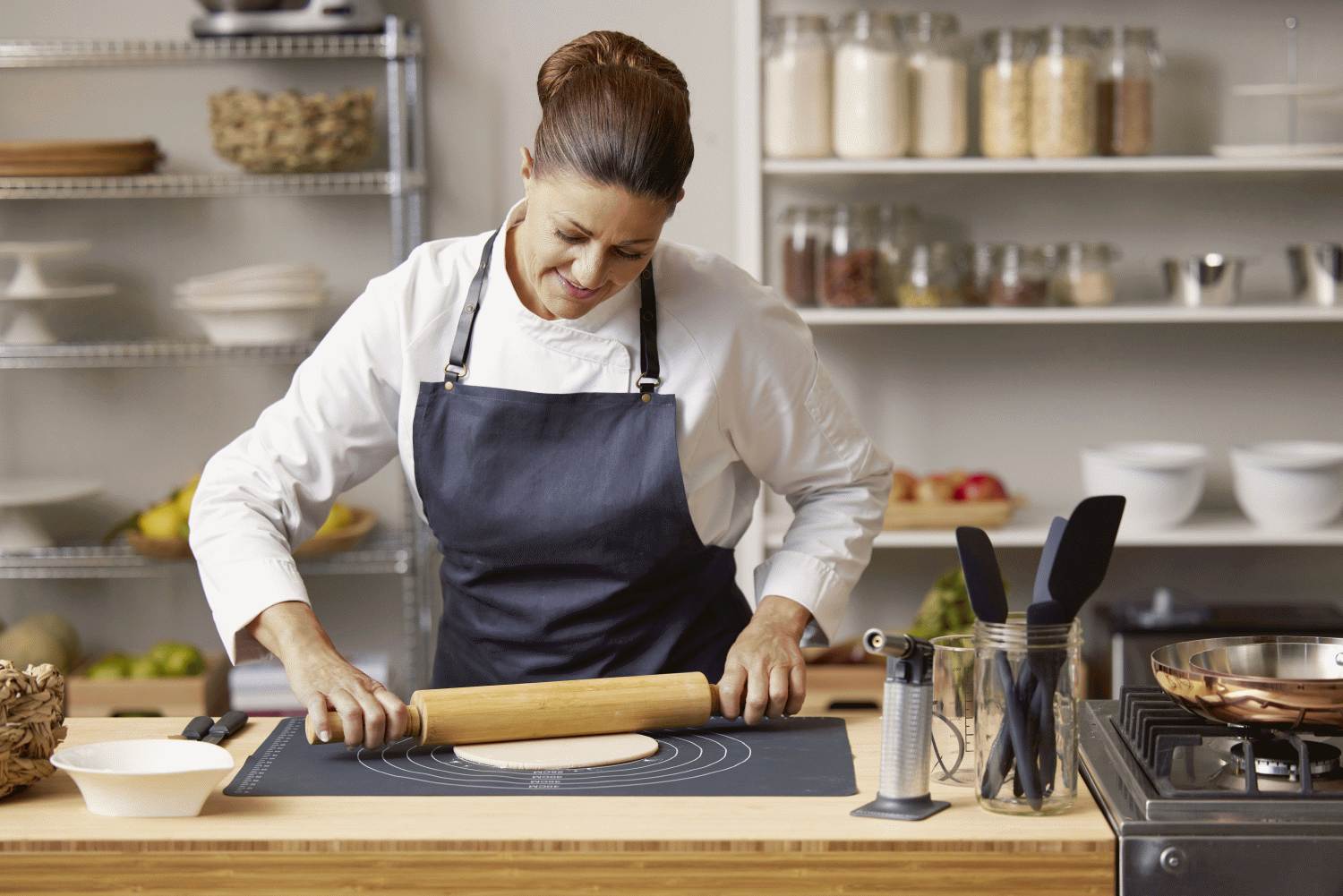 Underlaget er fremstillet af førsteklasses silikone i en elegant grå farve, der passer diskret ind i ethvert køkken. Den skridsikre overflade sikrer, at underlaget bliver liggende stabilt på bordpladen, selv når du ælter og ruller dej med kraft. Dette giver dig optimal kontrol over bagningen og mindsker risikoen for uheld.