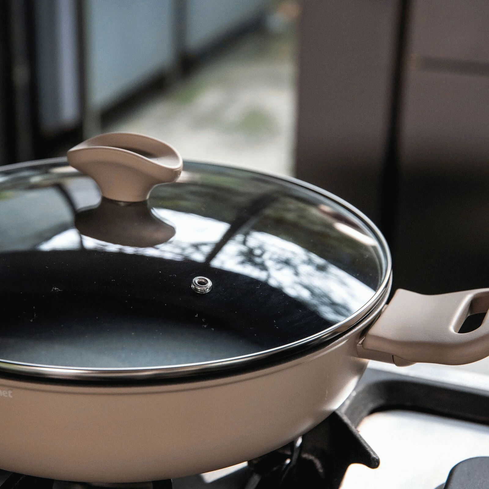 Låget er designet med en innovativ mineralbaseret non-stick teknologi, der sikrer en glat overflade og nem rengøring. Den ekstra forstærkede kant giver produktet en imponerende holdbarhed og modstandsdygtighed mod ridser, stød og buler, hvilket gør det ideelt til daglig brug i travle husholdninger.