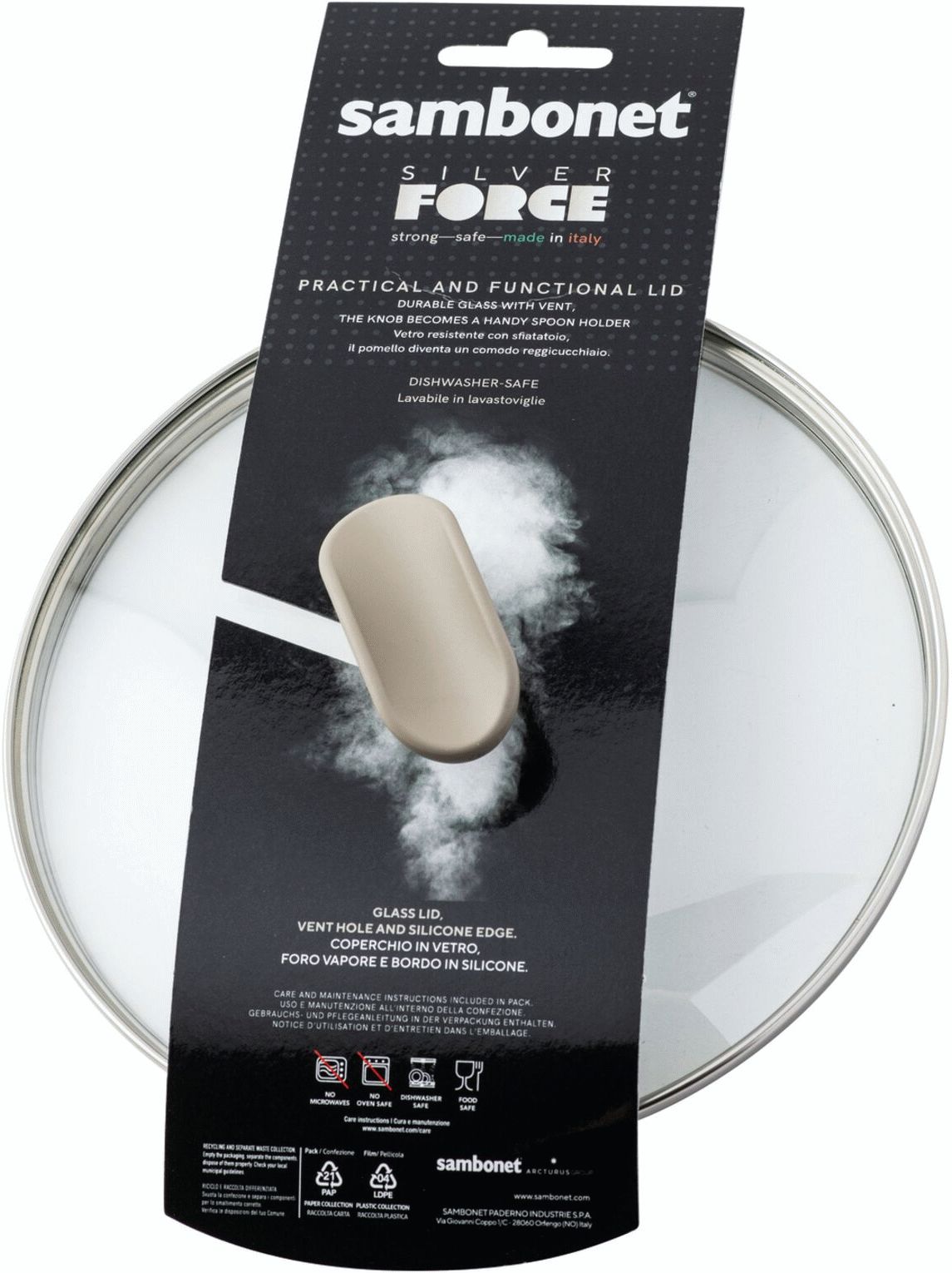 Sambonet Silver Force Glaslåg Ø24 cm kombinerer italiensk design med praktisk funktionalitet til det moderne køkken. Dette glaslåg er fremstillet i Italien og repræsenterer kvalitet og gennemtænkt håndværk, der gør hverdagens madlavning både nemmere og mere behagelig.Låget er designet med en innovativ mineralbaseret non-stick teknologi, der sikrer en glat overflade og nem rengøring. Den ekstra forstærkede kant giver produktet en imponerende holdbarhed og modstandsdygtighed mod ridser, stød og buler, hvilket gør det ideelt til daglig brug i travle husholdninger.