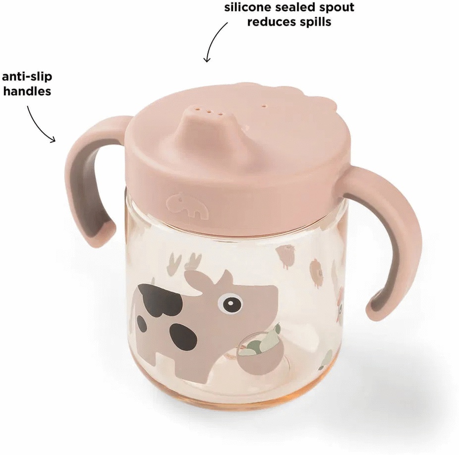 Koppen er udstyret med en silikoneforseglet tud, der hjælper med at reducere spild og gør det nemmere for barnet at drikke selvstændigt. De skridsikre håndtag er specielt tilpasset små hænder og sikrer et godt greb, så koppen kan holdes sikkert under måltiderne. Dette giver barnet en følelse af kontrol og selvstændighed, samtidig med at forældrene kan være trygge ved, at koppen sidder godt fast.
