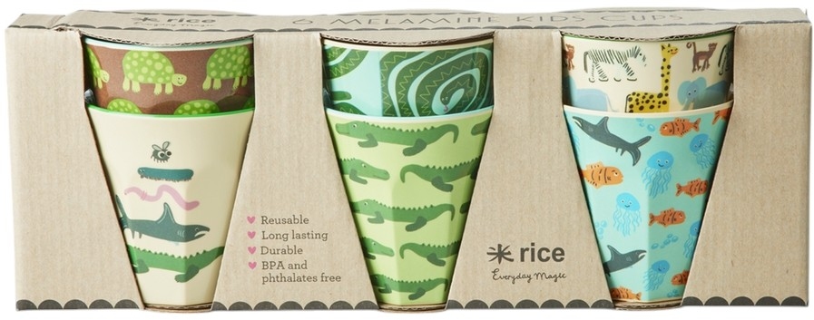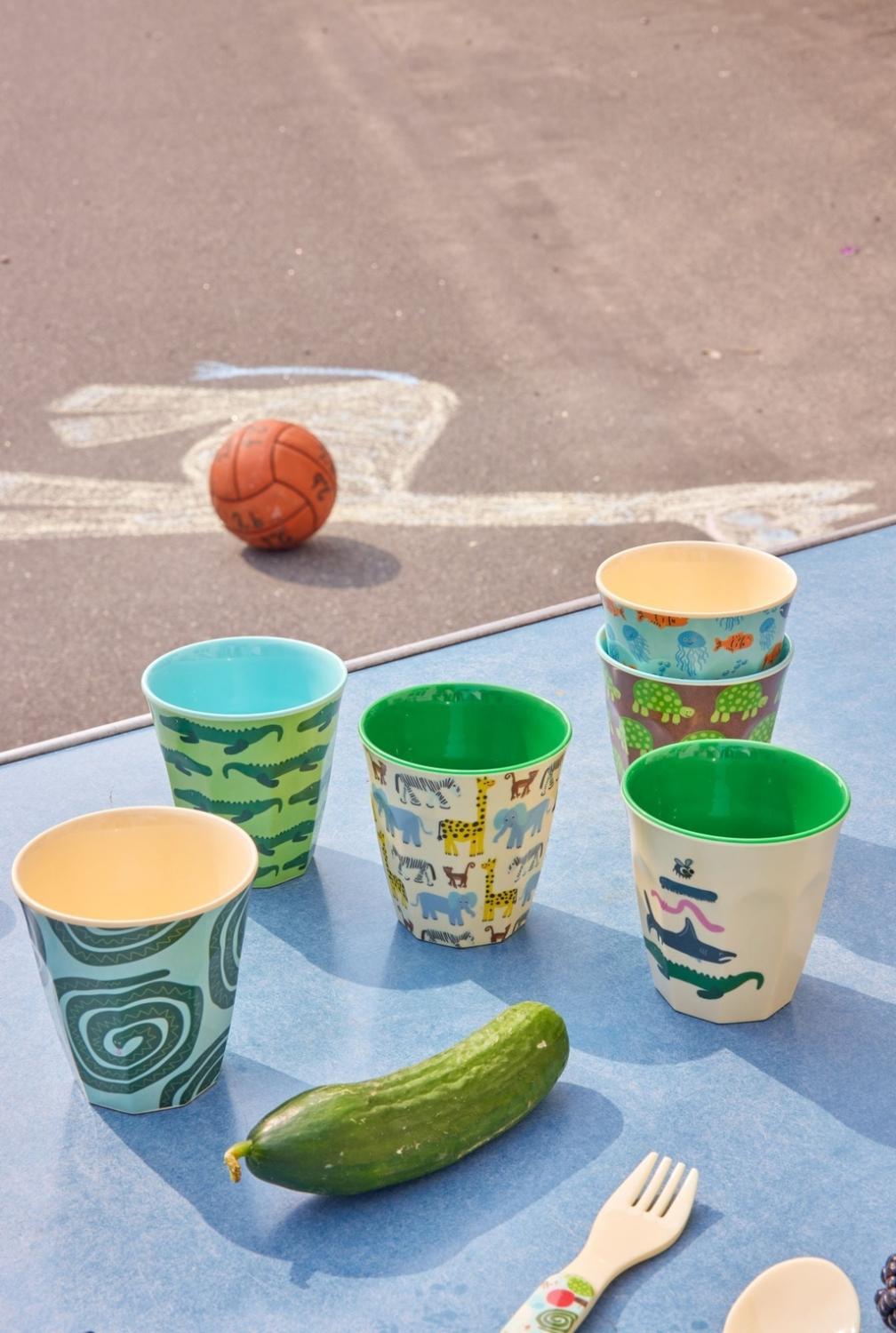 Farverige dyremotiver giver liv til hverdagen med RICE's sæt af seks små kopper i holdbar melamin. De sjove skildpadder, zebraer, hajer og andre dyr pryder disse praktiske 16 cl kopper i en frisk grøn multiprint, der med sikkerhed vil bringe smil frem hos både børn og voksne omkring bordet. Den robuste melamin konstruktion gør kopperne ideelle til hverdagsbrug, hvor de modstår daglige stød og fald bedre end traditionelt porcelæn.Disse kopper fra RICE forener funktionalitet med det legende og farverige design, som det danske mærke er kendt for. Med en diameter på 7 cm og en højde på 7,5 cm har kopperne den perfekte størrelse til juice, vand eller andre kolde drikke til både hverdag og fest.