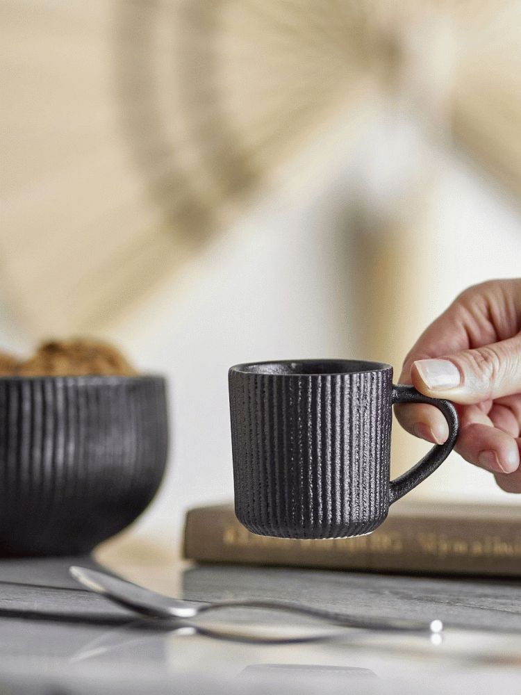 Koppens kompakte form gør den ideel til espresso, hvor den lodrette rillede overflade tilføjer en taktil dimension og et visuelt interessant design. Den let buede hank sikrer et komfortabelt greb, så du kan nyde din kaffe med lethed. Den mørke finish understreger det stilfulde udtryk og skaber en smuk kontrast til de lyse nuancer i din espresso eller cappuccino.