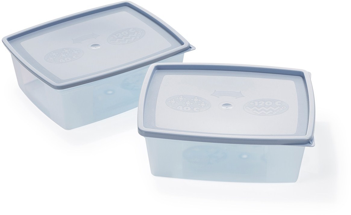 Frys/Mikro Opbevarings Boks 2,5 Lt. sæt á 2 Transparent/lyseblå Mål: 25,7x18,8x8,3cm Tåler frost og mikroovn, husk at åbne låget før brug i mikroovn. Praktiske bokse der er nemme at åbne og lukke, samt kan stables for nem opbevaring. De tåler at komme direkte fra frost i mikroovn. Max. Temperatur: -40gr.C til + 120 grader C. Tåler opvaskemaskine. Tætsluttende beholder, der bevarer smagen uden at påvirke fødevarer.