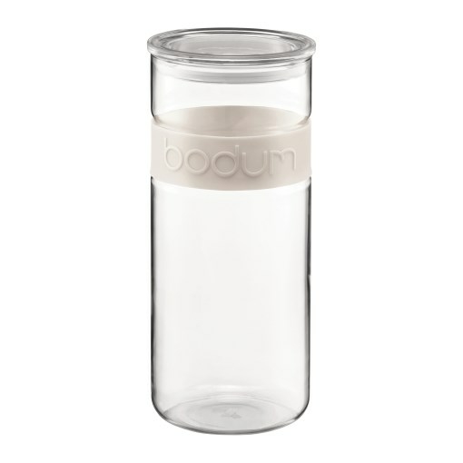 PRESSO opbevaringsglas fra Bodum. Hvid, 2,5L. Højde 28,3 cm, bredde 12,3 cm, dybde 12,3 cm. Lavet af silikone og borosilikat glas som kan tåle ekstremt høje temperaturer. Glasset, dog ikke låget, tåler mikroovn. Tåler opvaskemaskine.1. generation af PRESSO opbevaringsglas kom på markedet i 1982 og er siden blevet brugt igen og igen verden rundt, derfor introducerer Bodum nu 2. generation lavet af mere avancerede materialer og med højere funktionalitet.