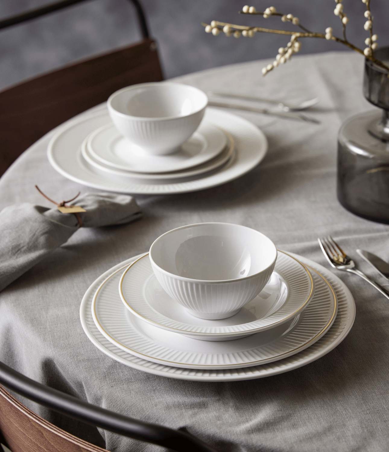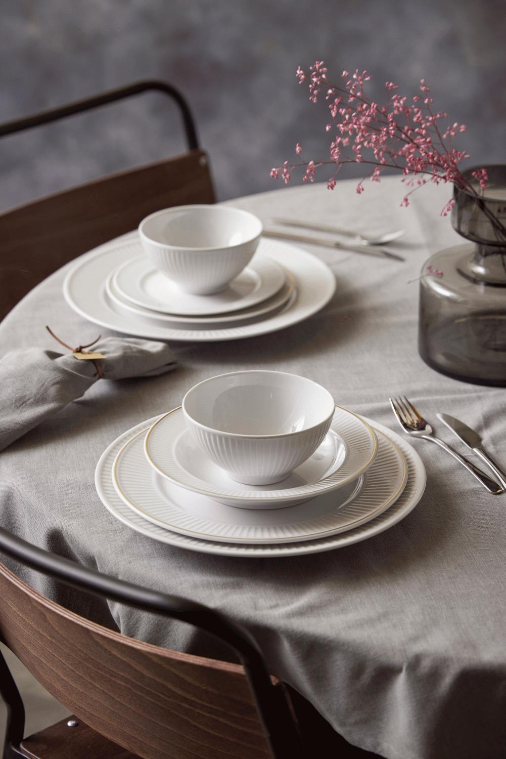 Den håndmalede guldkant tilfører et luksuriøst element til den klassiske Plissé-kollektion, der har vundet international anerkendelse for sin diskrete elegance. De karakteristiske plisserede linjer, inspireret af Pillivuyts originale støbeforme fra begyndelsen af 1900-tallet, giver tallerkenen et unikt udtryk, der hverken går på kompromis med funktionalitet eller æstetik.