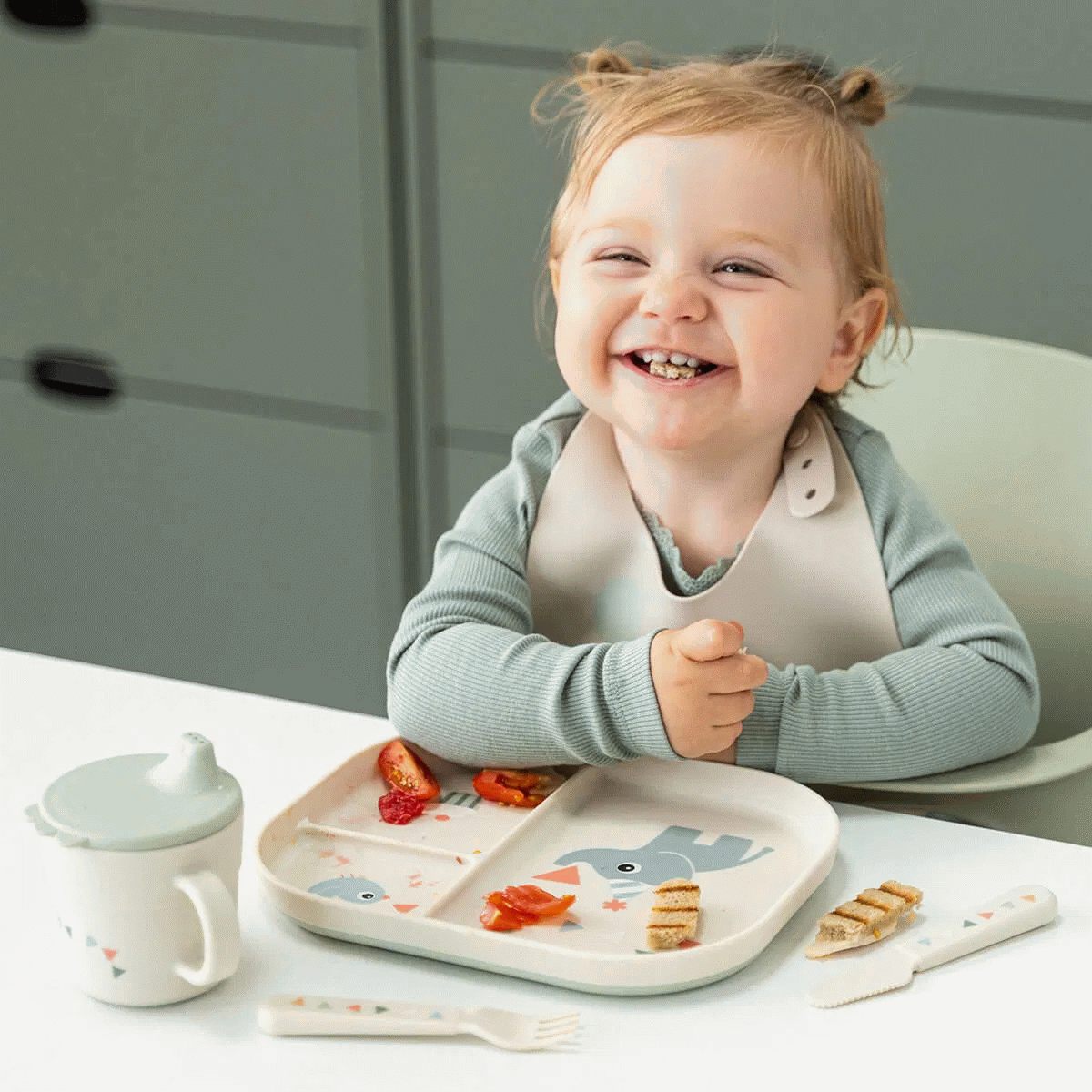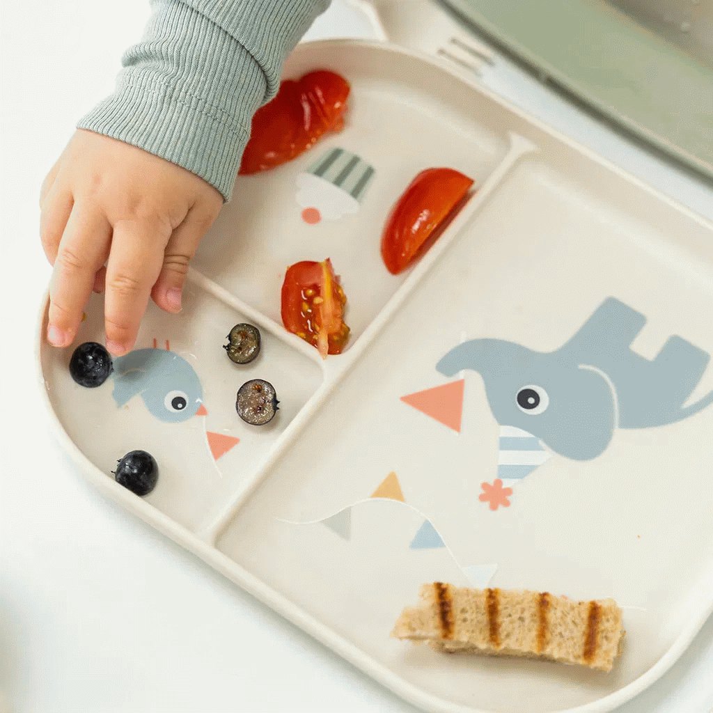 Done by Deer Celebration Foodie Tallerken bringer funktionalitet og gennemtænkt design sammen i en praktisk løsning til børnenes måltider. Med sine tre separate rum i forskellige størrelser gør tallerkenen det nemt at servere varierede retter, hvor hver madtype kan holdes adskilt – perfekt til de små gourmeter, der foretrækker, at maden ikke blandes sammen.Tallerkenen er designet med den høje kant, der gør det lettere for barnet at skovle maden op på skeen eller gaflen. Dette smarte designelement understøtter barnets naturlige udvikling og giver dem mulighed for at spise mere selvstændigt, hvilket styrker deres selvtillid ved bordet. Den skridsikre base sikrer, at tallerkenen forbliver stabil under hele måltidet, selv når de små hænder er i fuld gang med at udforske maden.