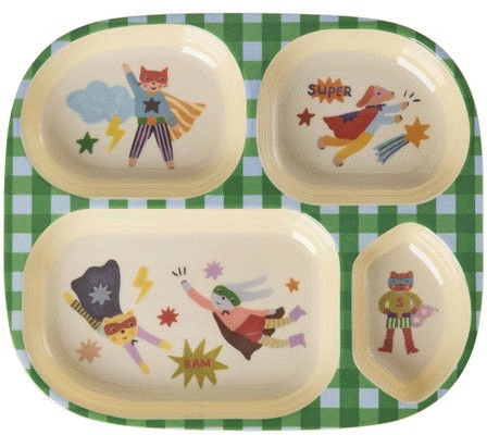 RICE KIDS Hero børnetallerken bringer superhelte-magi til børnenes måltider med sit charmerende design i grønne nuancer. Denne gennemtænkte tallerken er designet med fire separate rum, der gør det nemt og sjovt for de mindste at opdage nye smagsvariationer uden at maden blander sig. Det er den perfekte løsning til børn, der foretrækker at holde deres mad adskilt, og som elsker at udforske nye retter i deres eget tempo.Tallerkenen er fremstillet i melamin, et robust materiale der tåler det daglige liv med børn. Materialets styrke gør den ideel til hverdagens måltider, hvor den kan modstå både små og store uheld. Den glatte overflade sikrer samtidig, at tallerkenen er utrolig let at holde ren - noget enhver forælder vil sætte pris på i en travl hverdag.