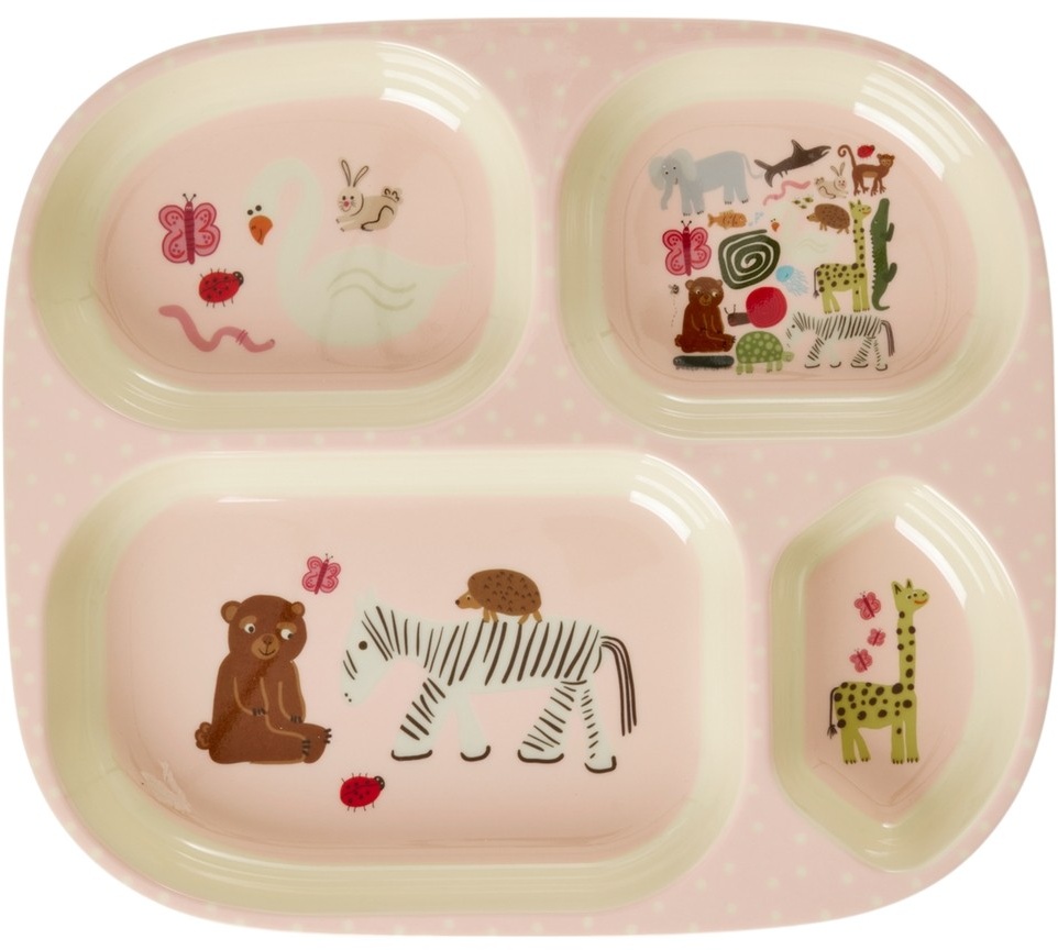 Fin og funktionel 4-rums børnetallerken i melamin… med det sødeste dyretema i lyserøde nuancer. Melamin er holdbart og perfekt til dagligt brug på grund af dets styrke og nemme rengøring. Det absorberer ikke farve eller smag fra maden, og det gør det let for de mindste at udforske nye og spændende smage.Vær opmærksom på, at produktet ikke er egnet til mikroovn.