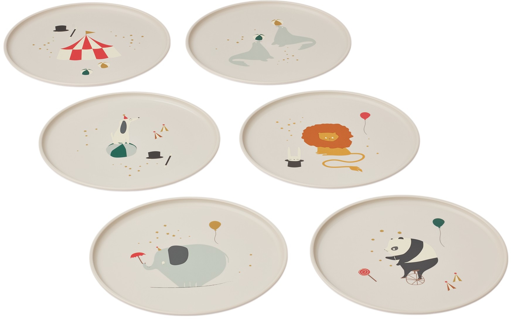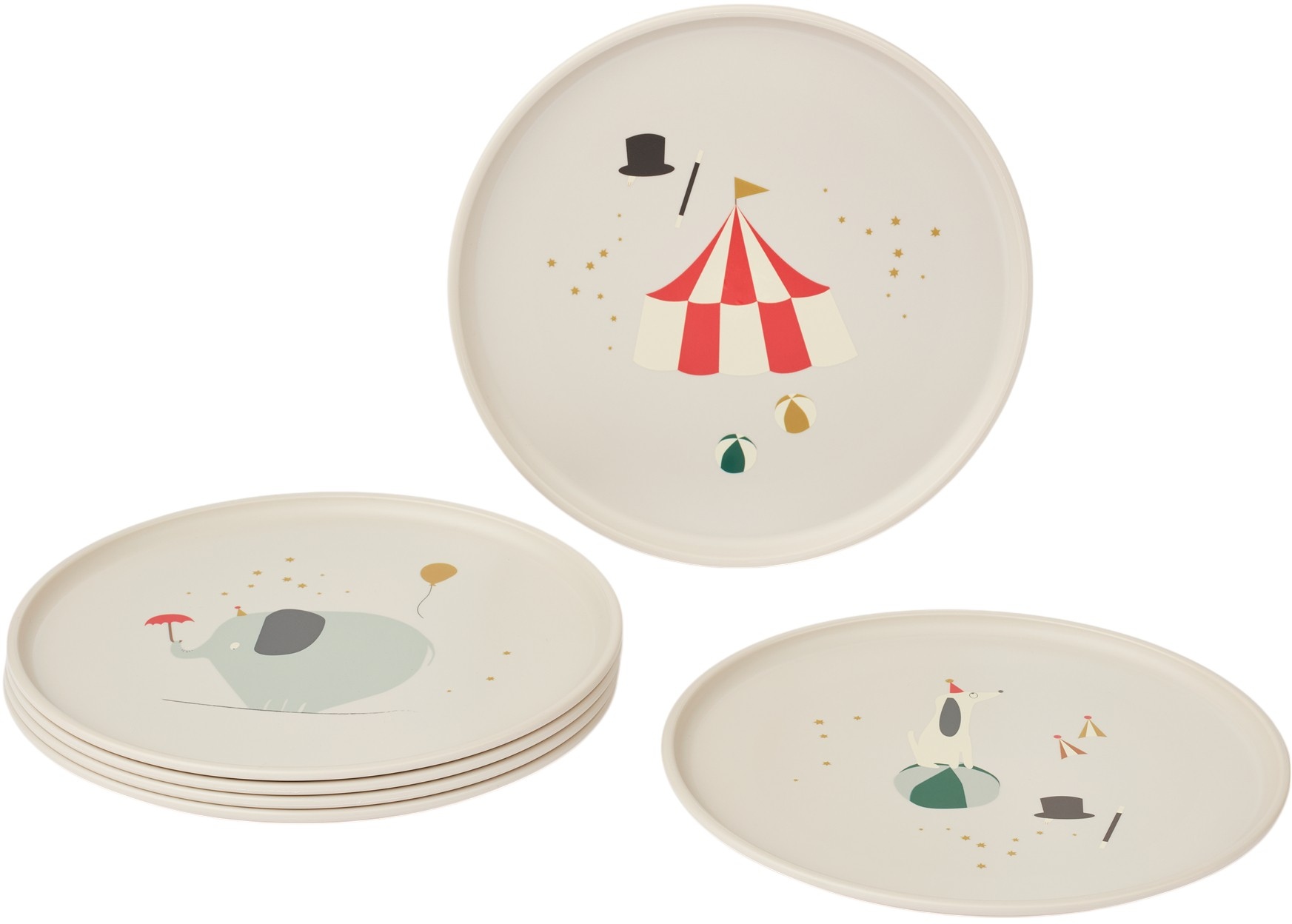- Sæt med 6 tallerkener i Circus/Sandy farvetema