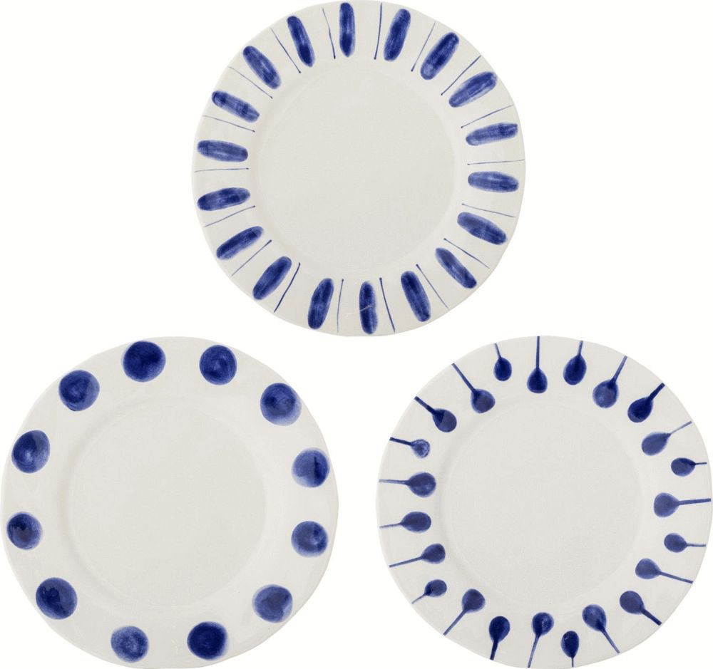 - Sæt med tre tallerkener i stentøj med håndmalet blå kant