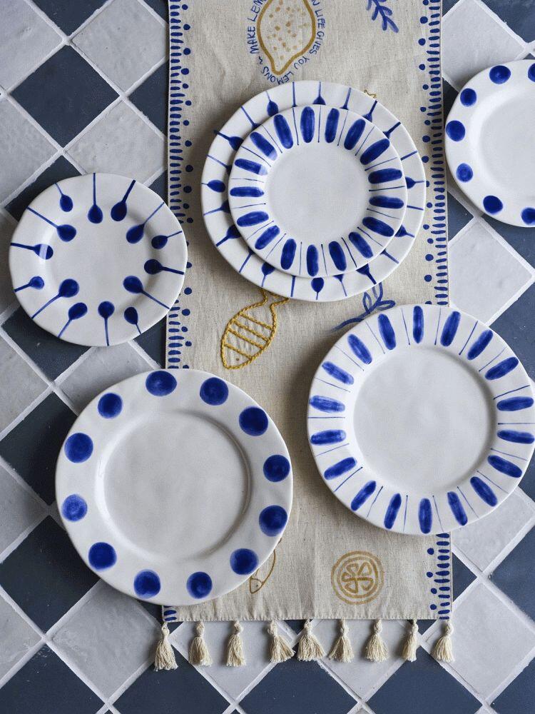 Den blå kant er prydet med mønstre af prikker, strøg og små dråber, der er malet i hånden. Denne fremstillingsmetode betyder, at små variationer i mønster og farvens intensitet naturligt forekommer fra tallerken til tallerken. Det er netop disse små forskelle, der giver sættet dets særlige karakter og autentiske udtryk. Ingen to tallerkener er helt ens, hvilket tilføjer en personlig dimension til bordet.