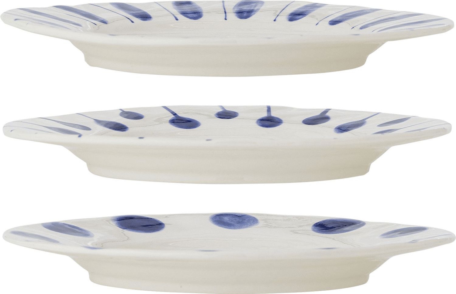 Creative Collection Linora Tallerken i 3 stykker bringer en personlig og håndlavet atmosfære til borddækningen. Dette sæt består af tre tallerkener i stentøj, hvor hver enkelt er formet med omhu og dekoreret med en unik blå kant. Den lyse bund skaber en neutral base, mens den håndmalede kant tilføjer et levende og kunstnerisk udtryk, der gør hver tallerken til et individuelt stykke.Den blå kant er prydet med mønstre af prikker, strøg og små dråber, der er malet i hånden. Denne fremstillingsmetode betyder, at små variationer i mønster og farvens intensitet naturligt forekommer fra tallerken til tallerken. Det er netop disse små forskelle, der giver sættet dets særlige karakter og autentiske udtryk. Ingen to tallerkener er helt ens, hvilket tilføjer en personlig dimension til bordet.